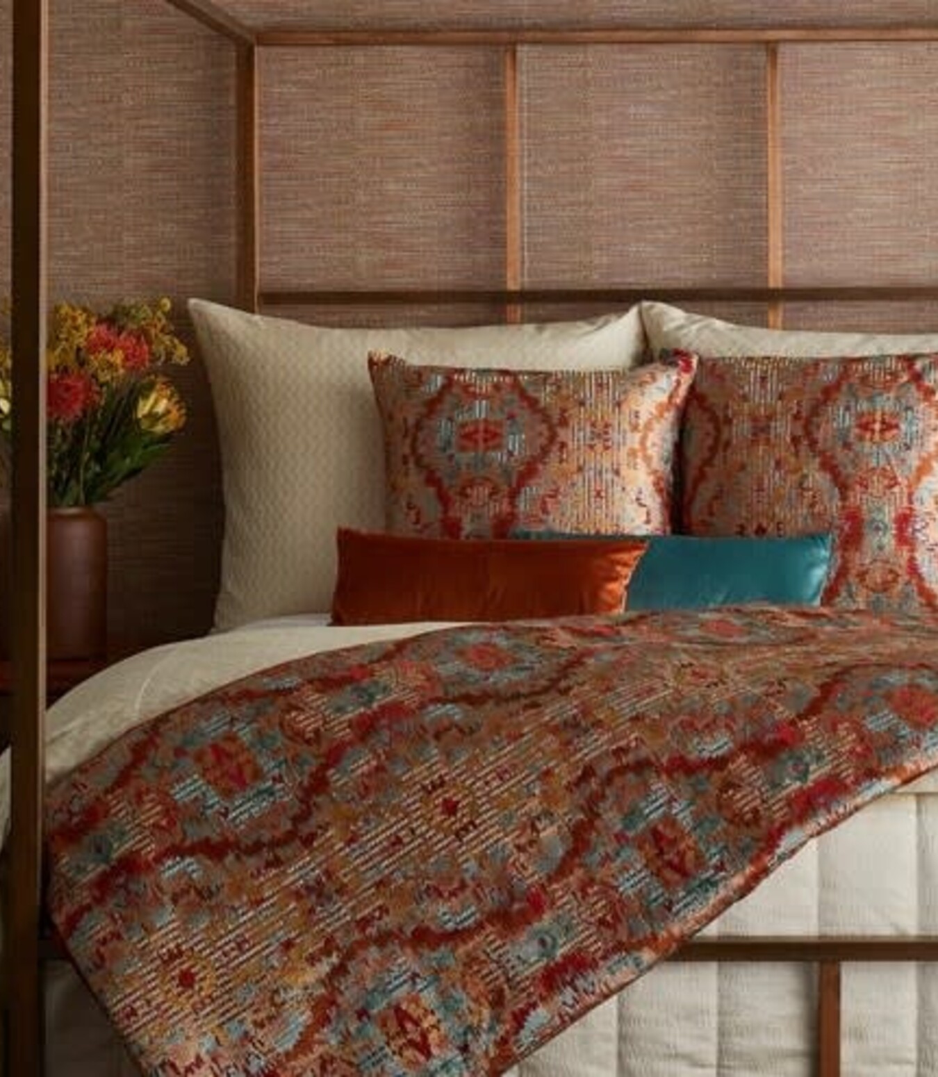 Inspired by a cup from Ancient Egypt given to the Pharoah as part of a dowry, hence its name in our line, Dowry. With this cup, two things immediately stood out - the color palette and the ogee shape of the cup itself. To highlight those two parts of the design, we began with a freehand ogee layout, then filled in the background with that gorgeous terra cotta color, as well as contrasting and complementary tones. The result is a stunning embroidered design, rich in both history and colors.