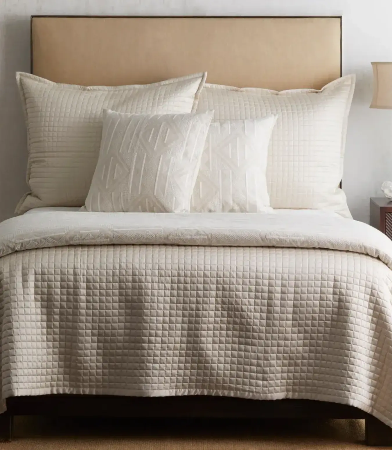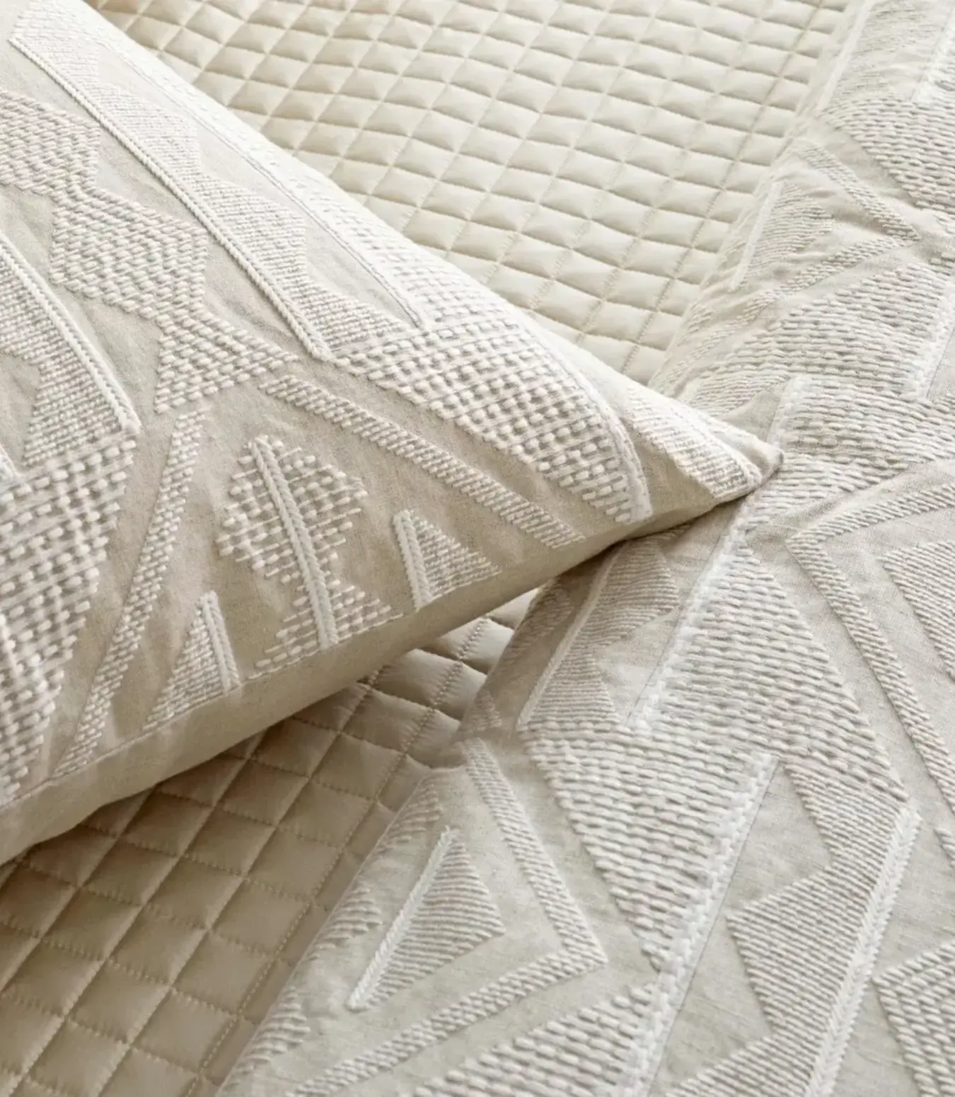 Inspired by the geometry of prestige panels, this white embroidery on natural ground is sophisticated yet organic.