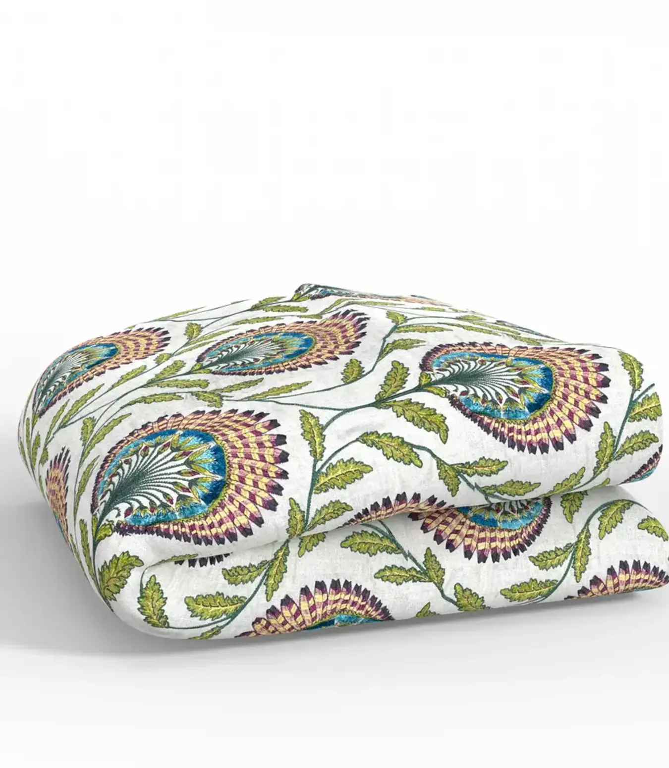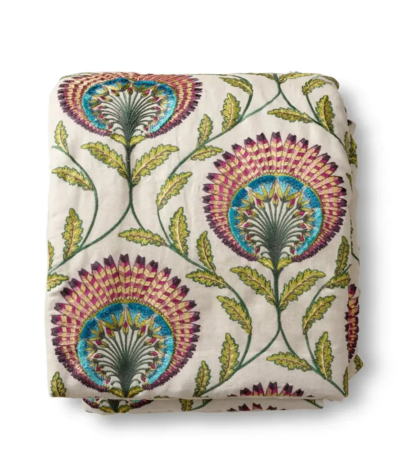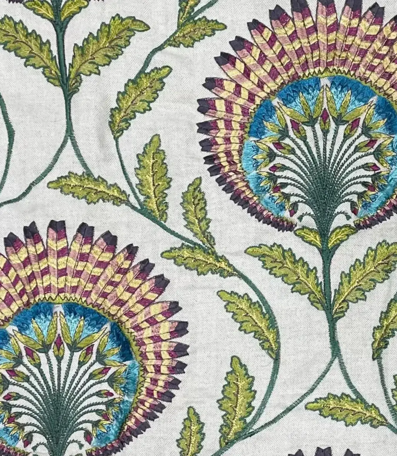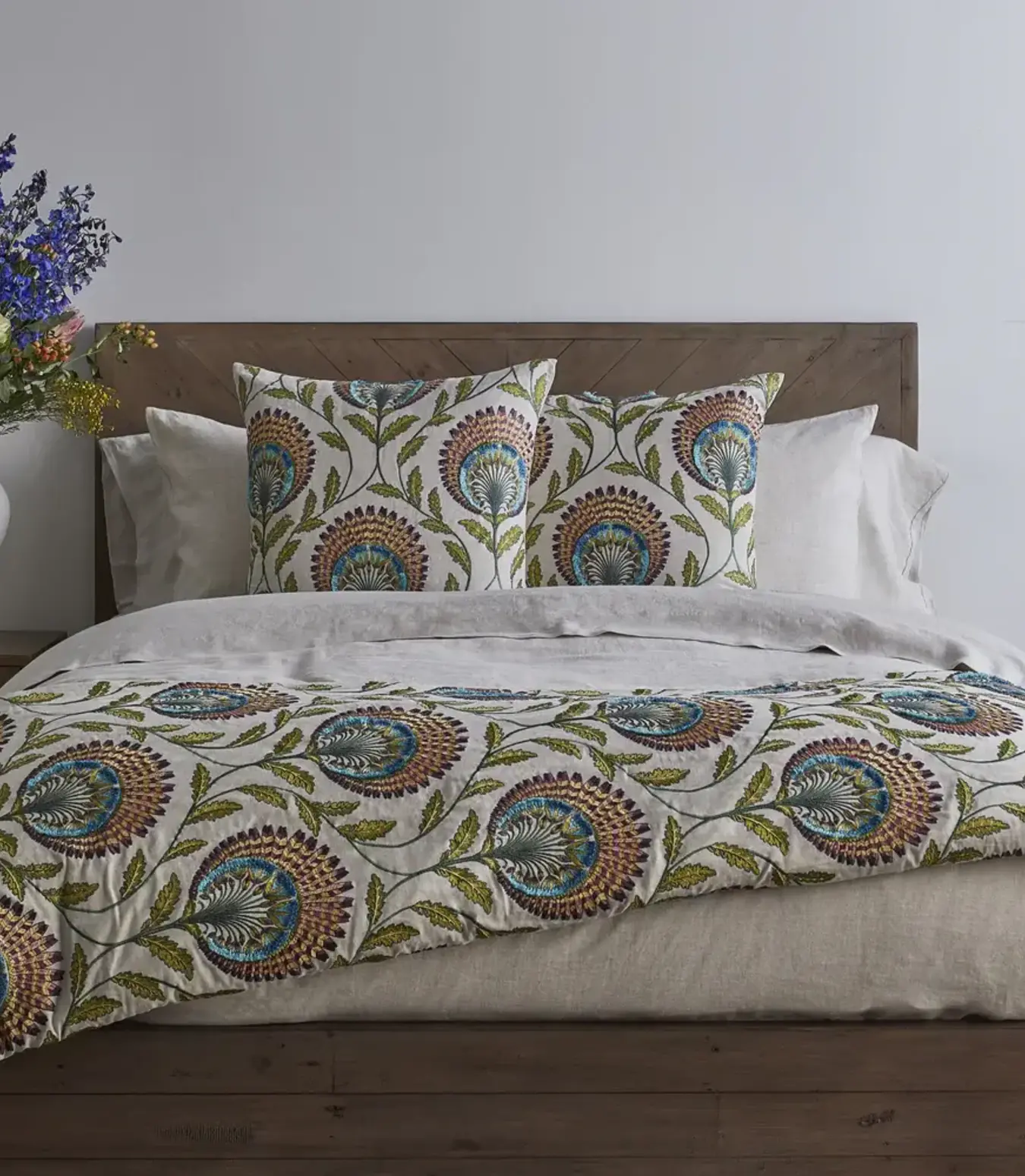 Inspired by a 16th century Ottoman dish, this design means 'peacock' in Turkish. Embroidered on a herringbone ground in many colors, with decorative clipped fringe.