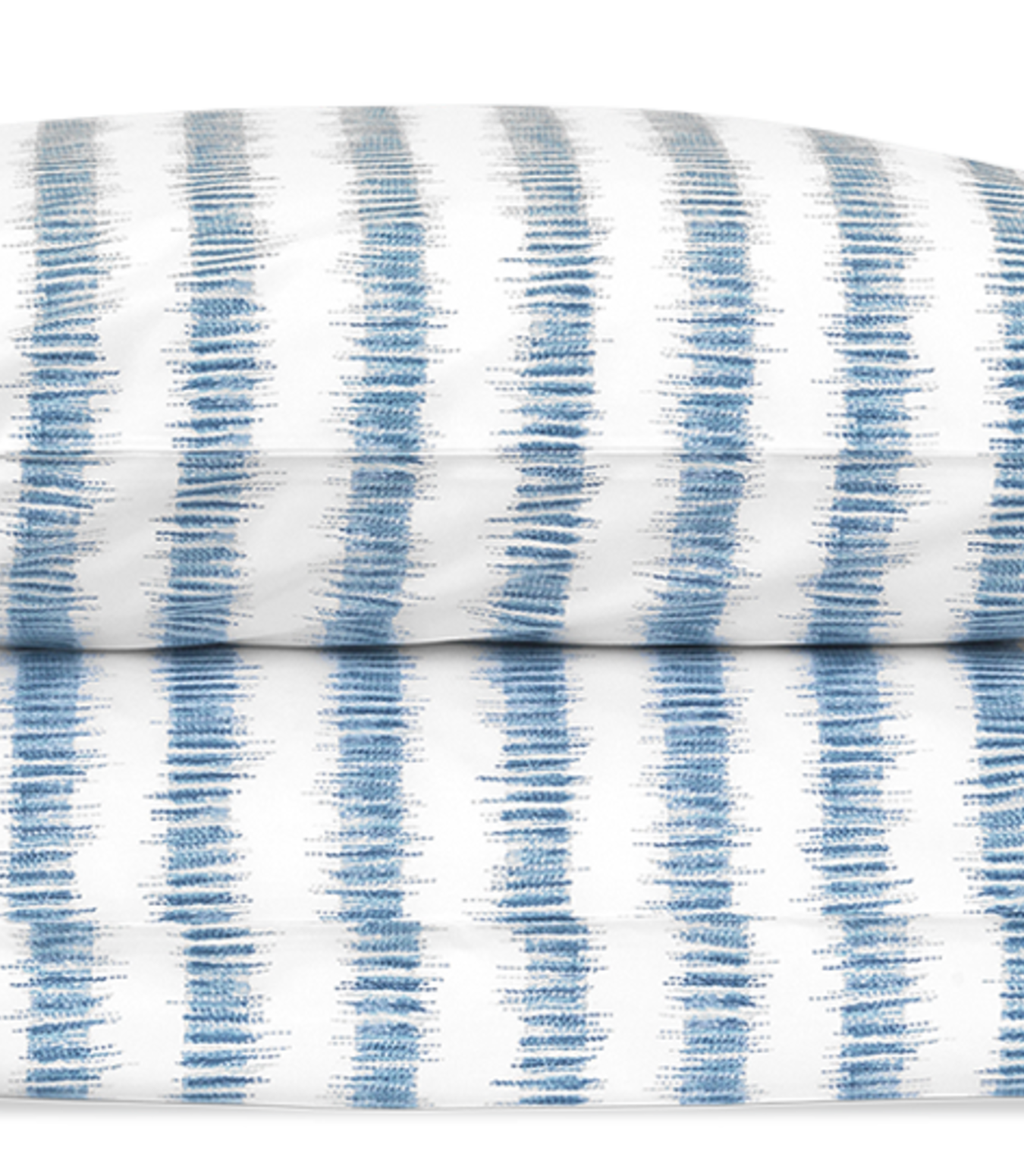 Attleboro, a print drawn from an archival Schumacher design, mimics the distinctive look of dyed textiles; here, Ikat-like blurred strokes are arranged in hazy stripes and printed on our Luca percale. Attleboro’s palette of subtle colors matches back beautifully to our bold Pomegranate print, bringing a modern verve to that traditional pattern.