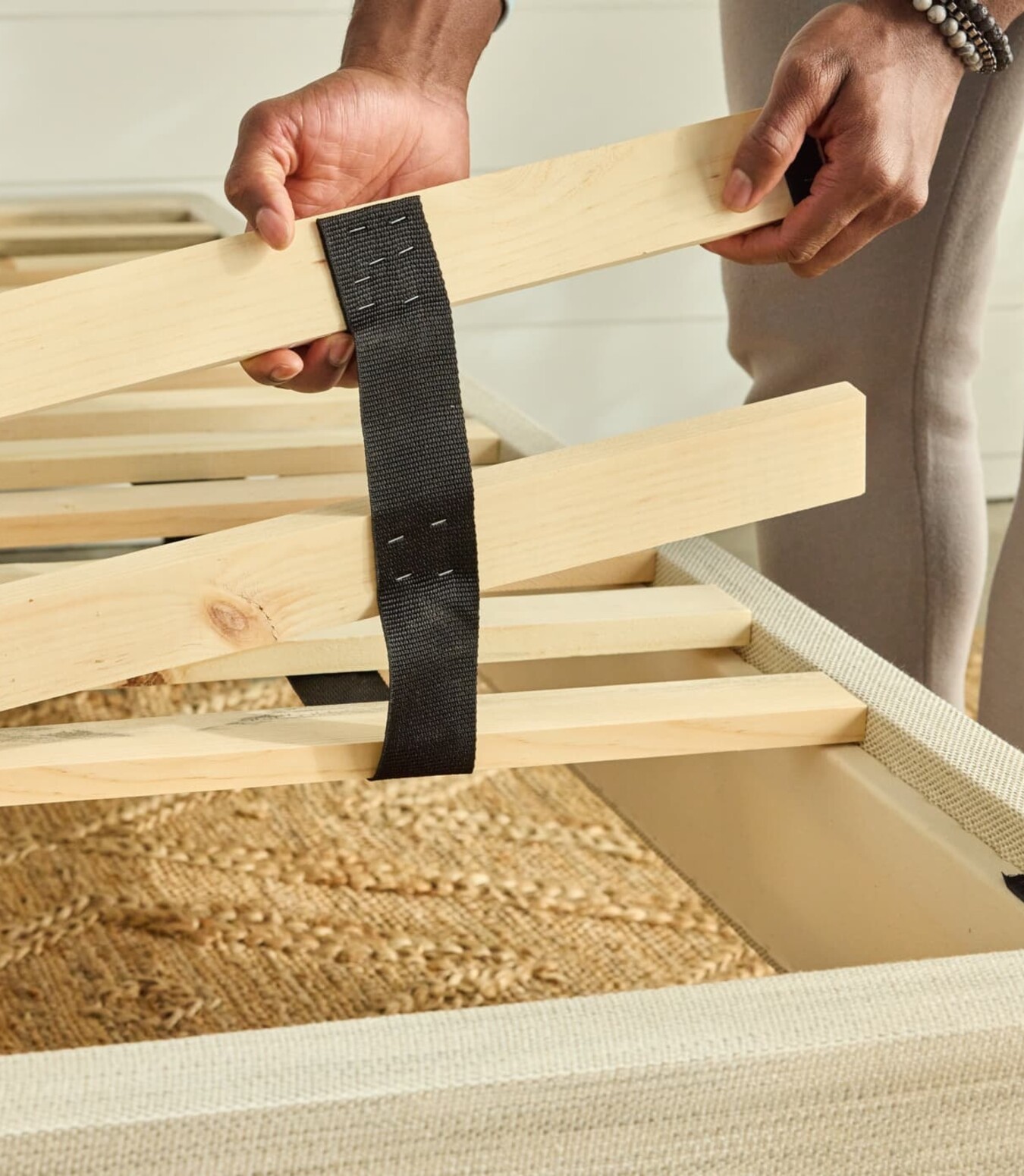The minimalist design of our Avocado Green Foundation with legs can be easily assembled in just minutes — without tools! Simply lock the four outermost wood frame rails together, insert the provided locking pin, add the center support frame, and roll out the woven slatted surface on the top. Yes, it’s that simple.