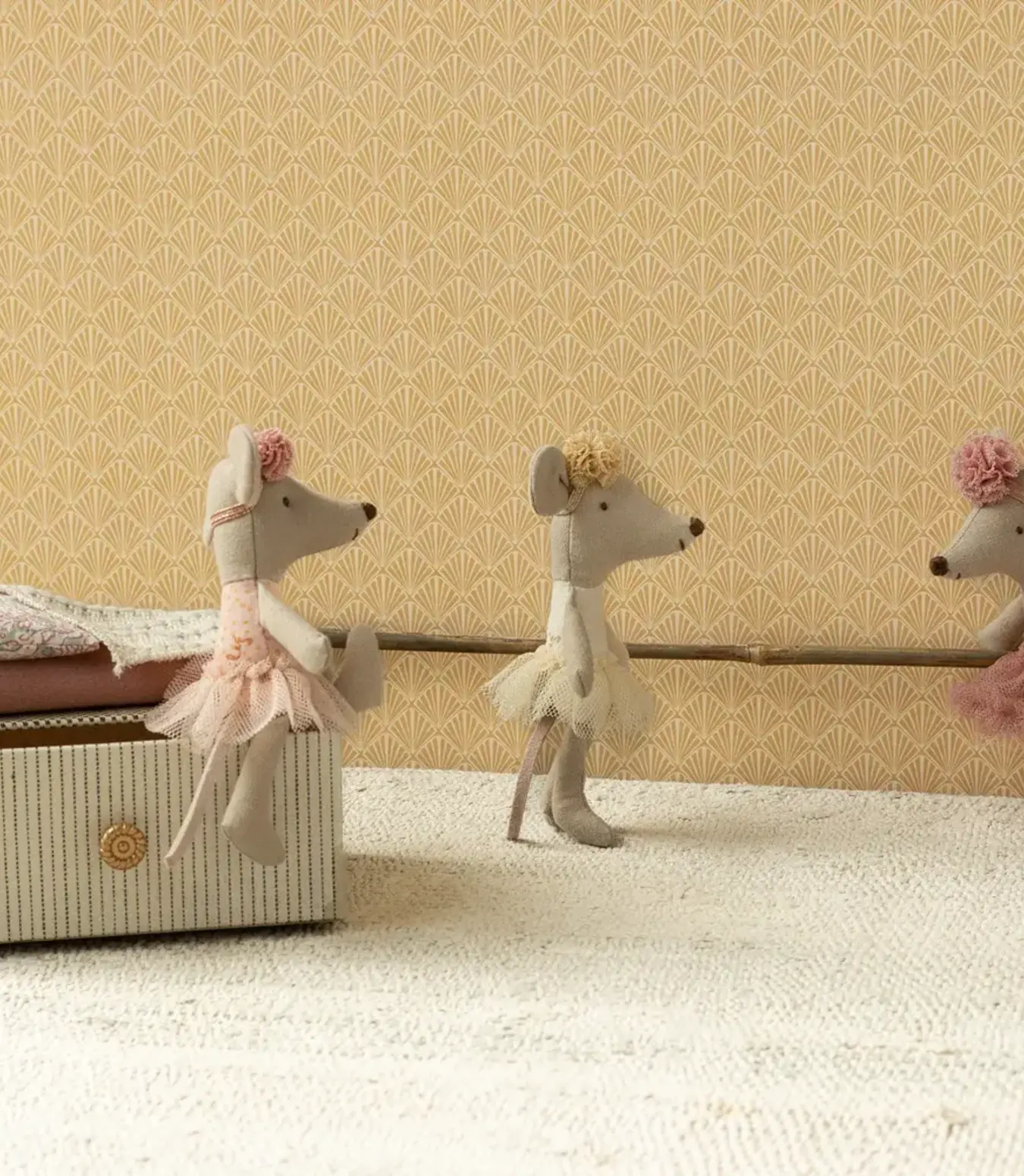A little sister mouse dressed up like a graceful ballerina. She wears a beautiful off white colored tutu and a beautiful headband - ready for hours of dance.