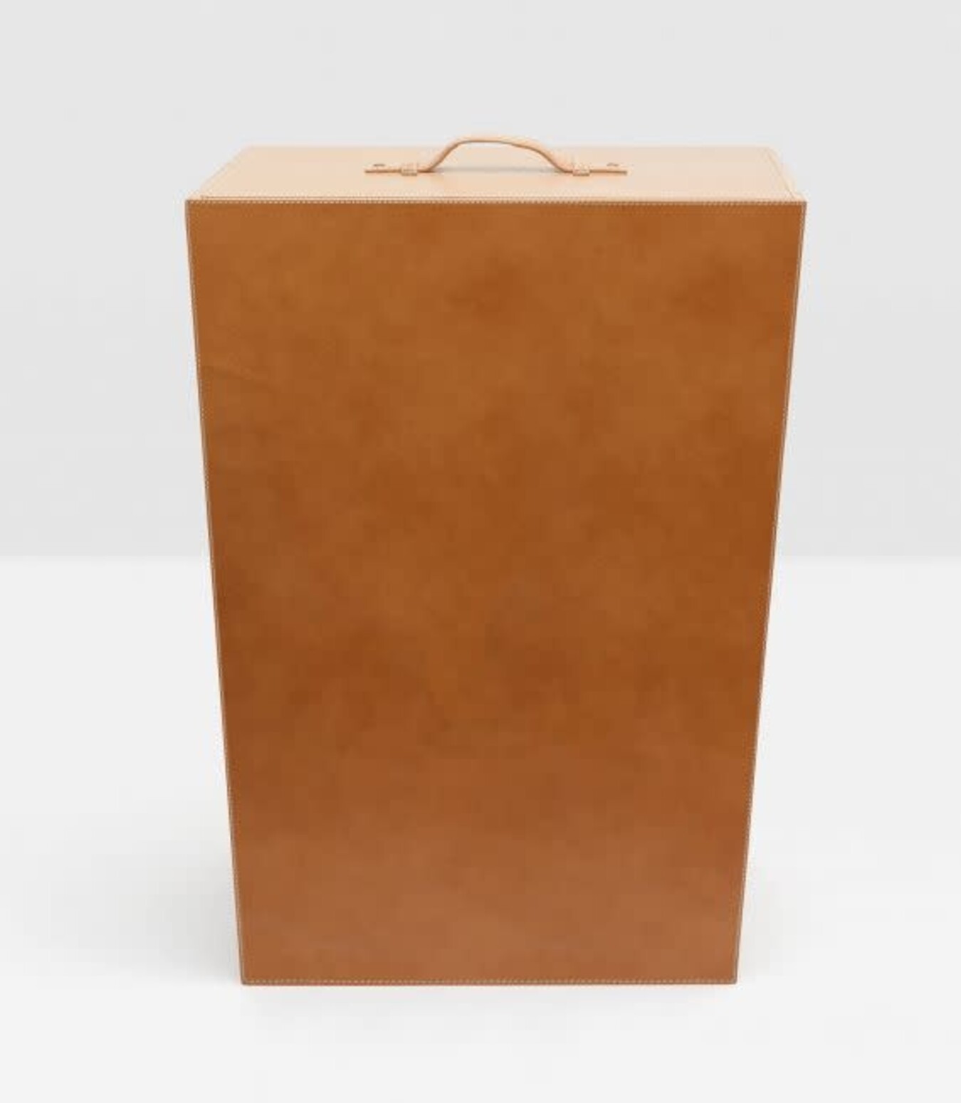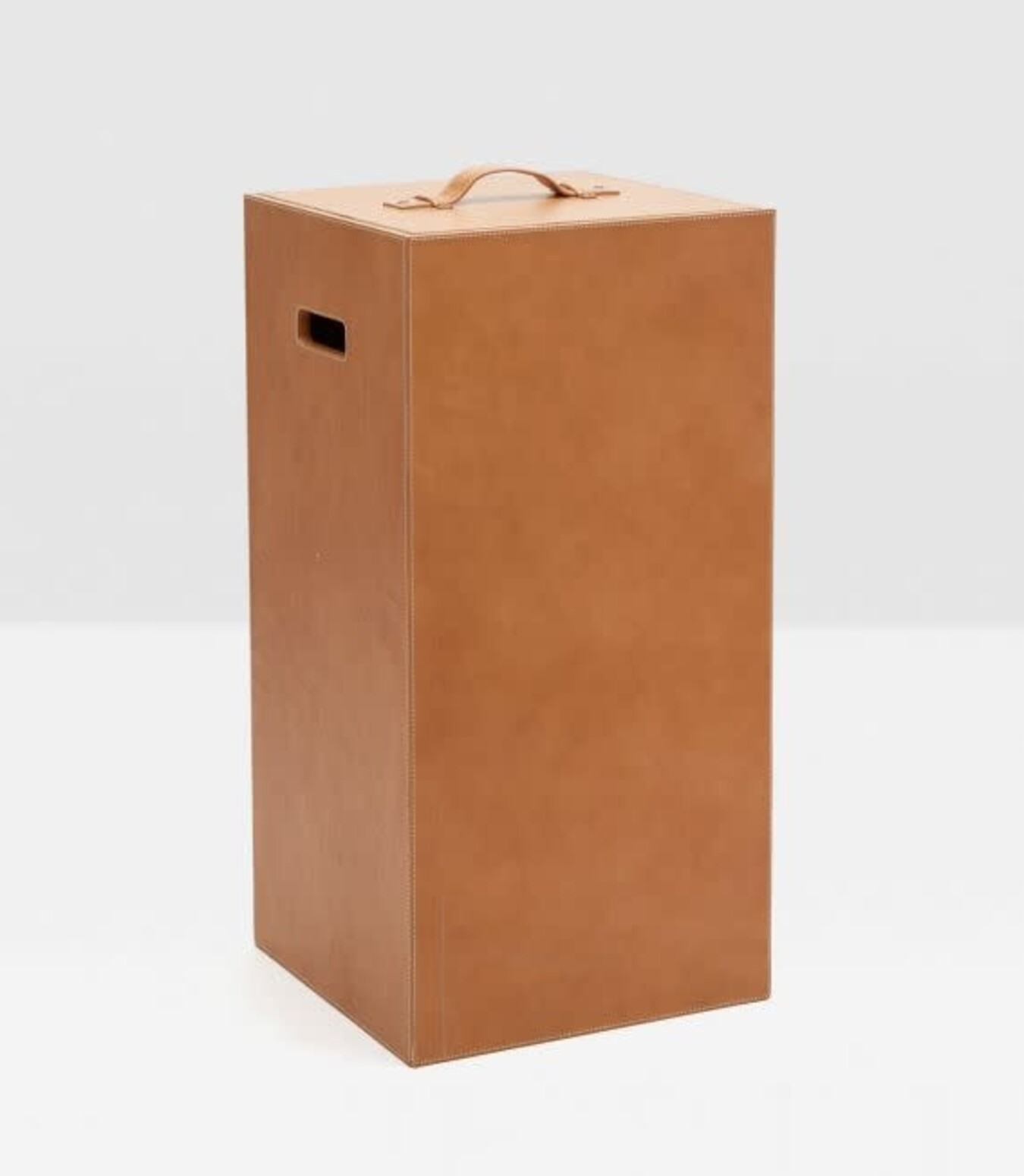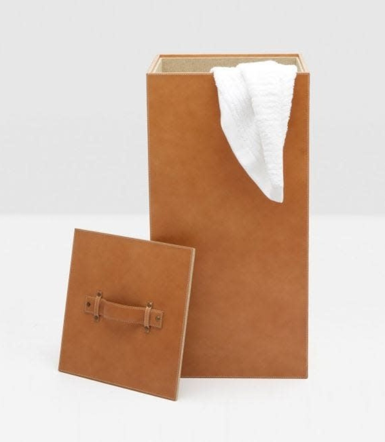 Sleek leather hamper with chambray interior. Available in square or rectangular.