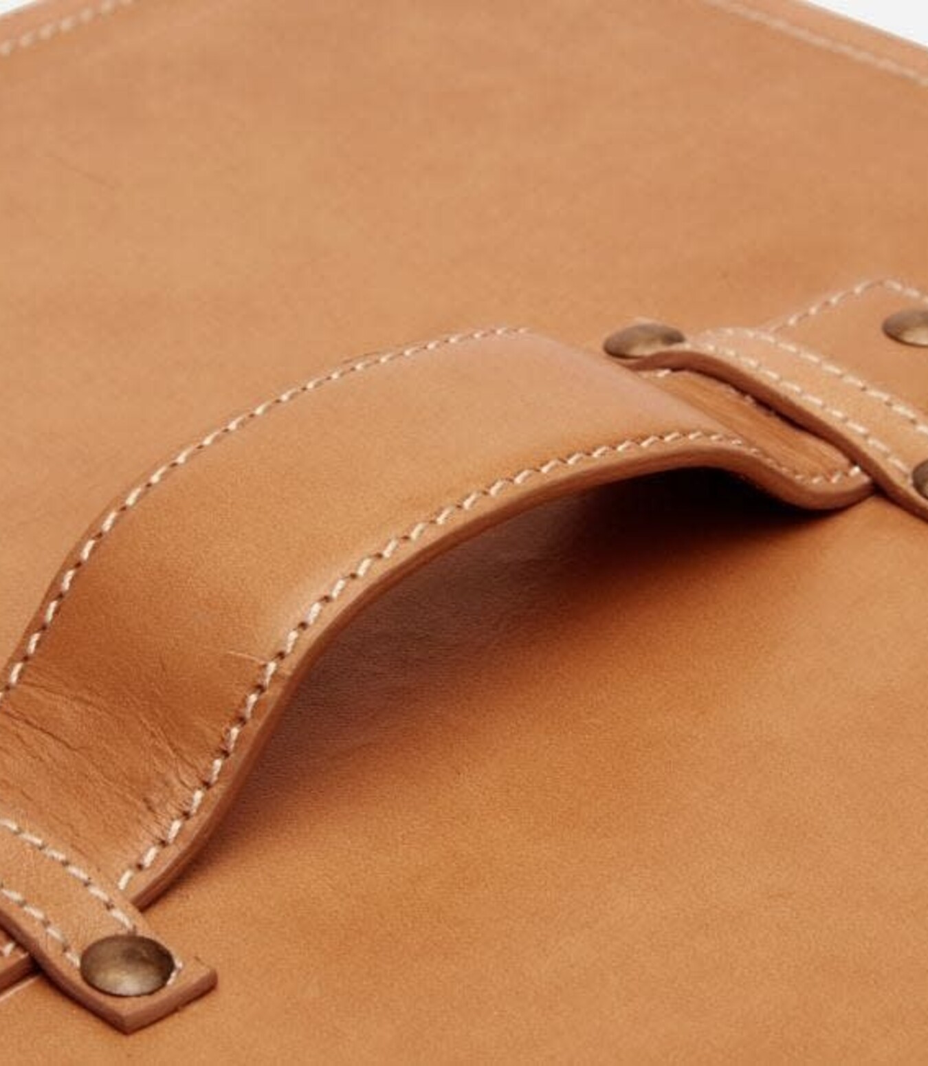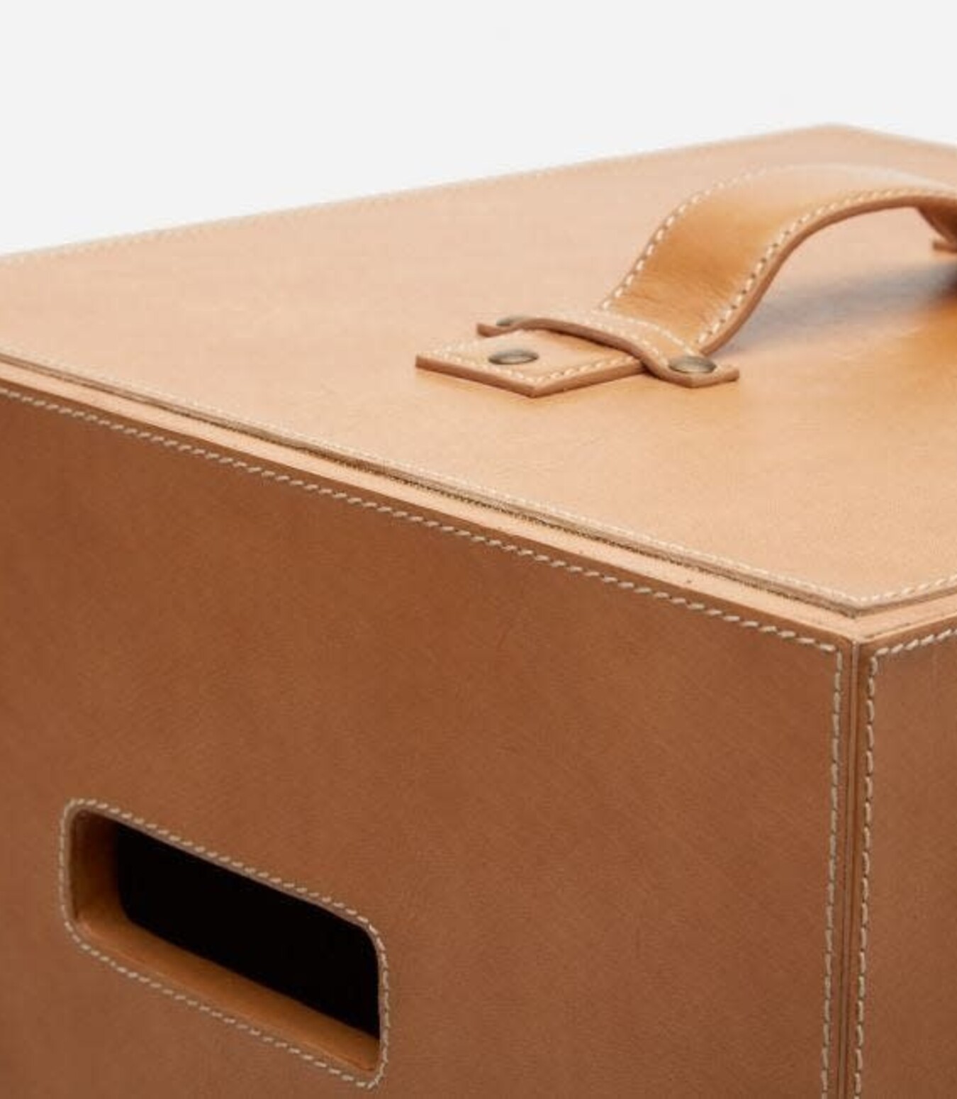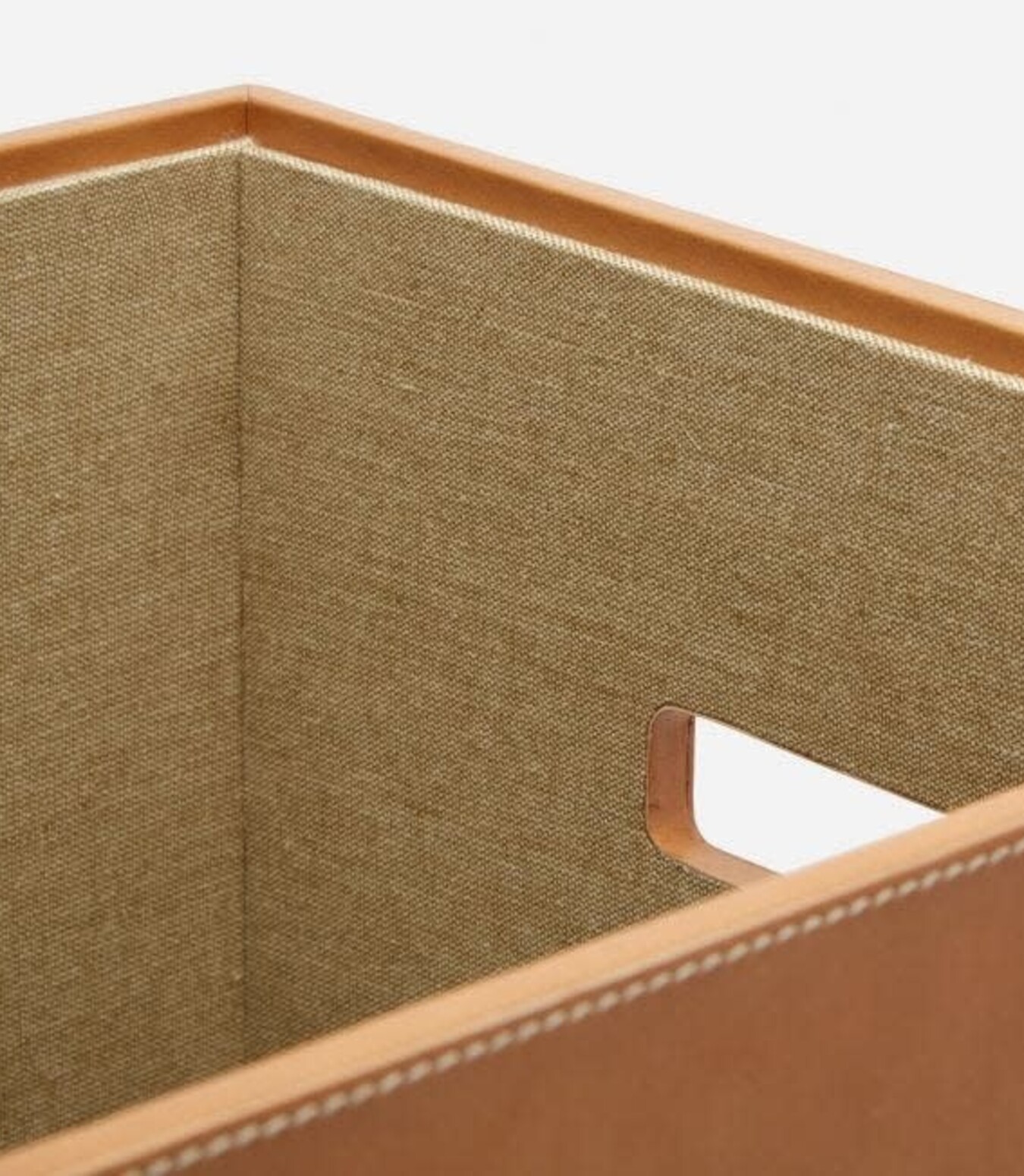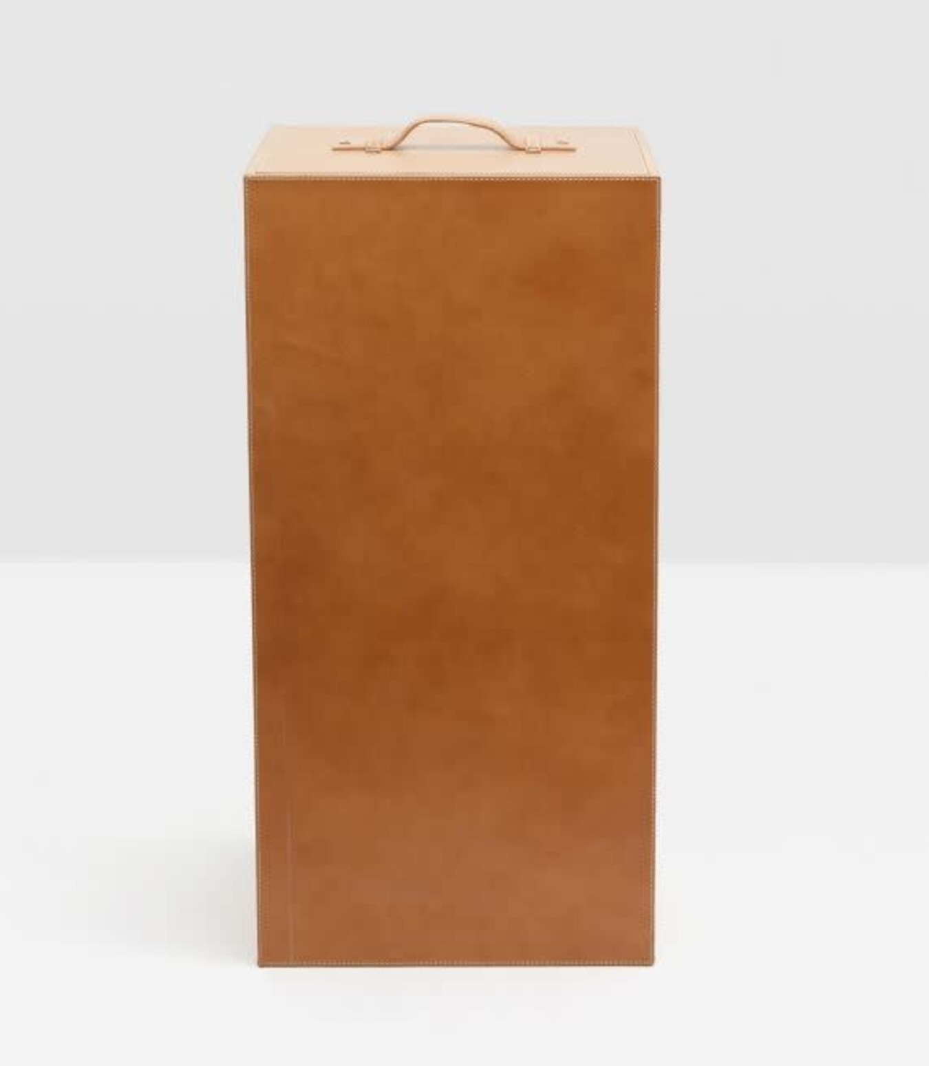 Sleek leather hamper with chambray interior. Available in square or rectangular.