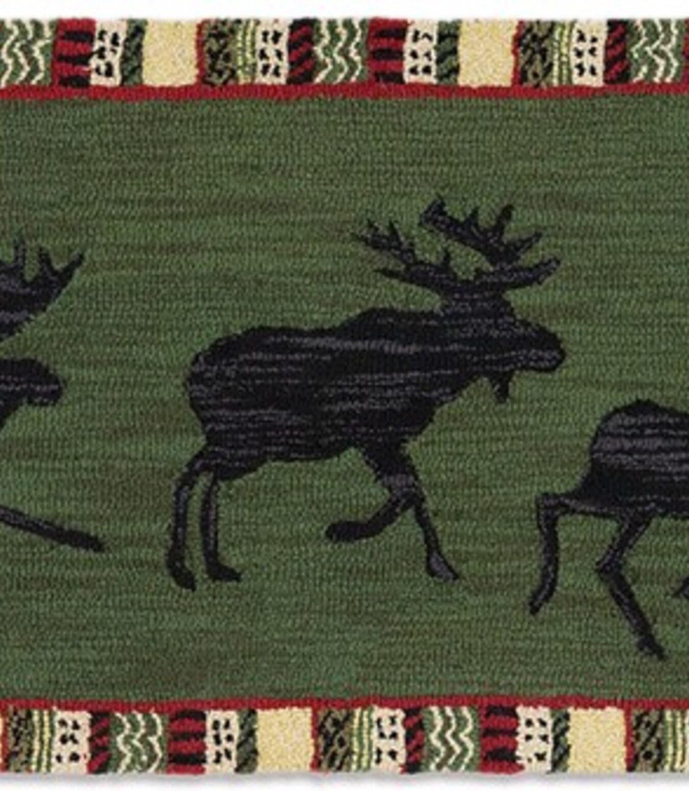 These striated moose ramble along a rich green background with an interesting, colorful border.