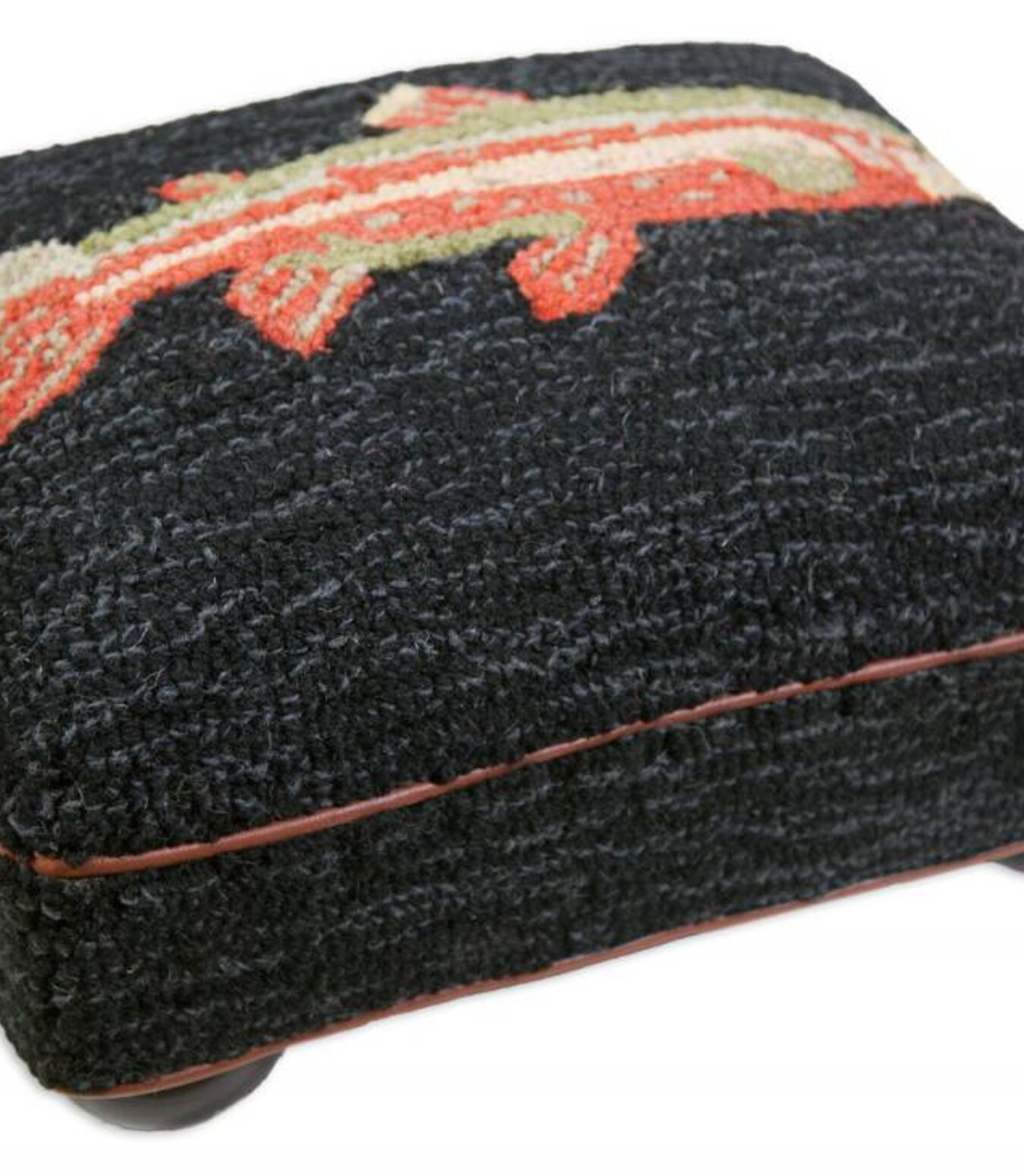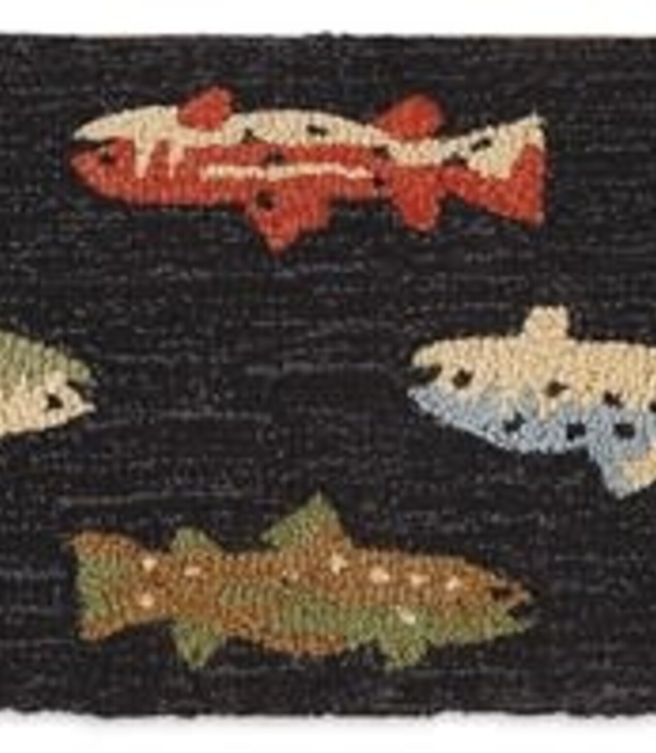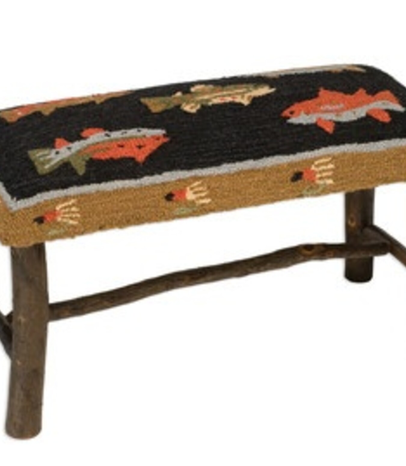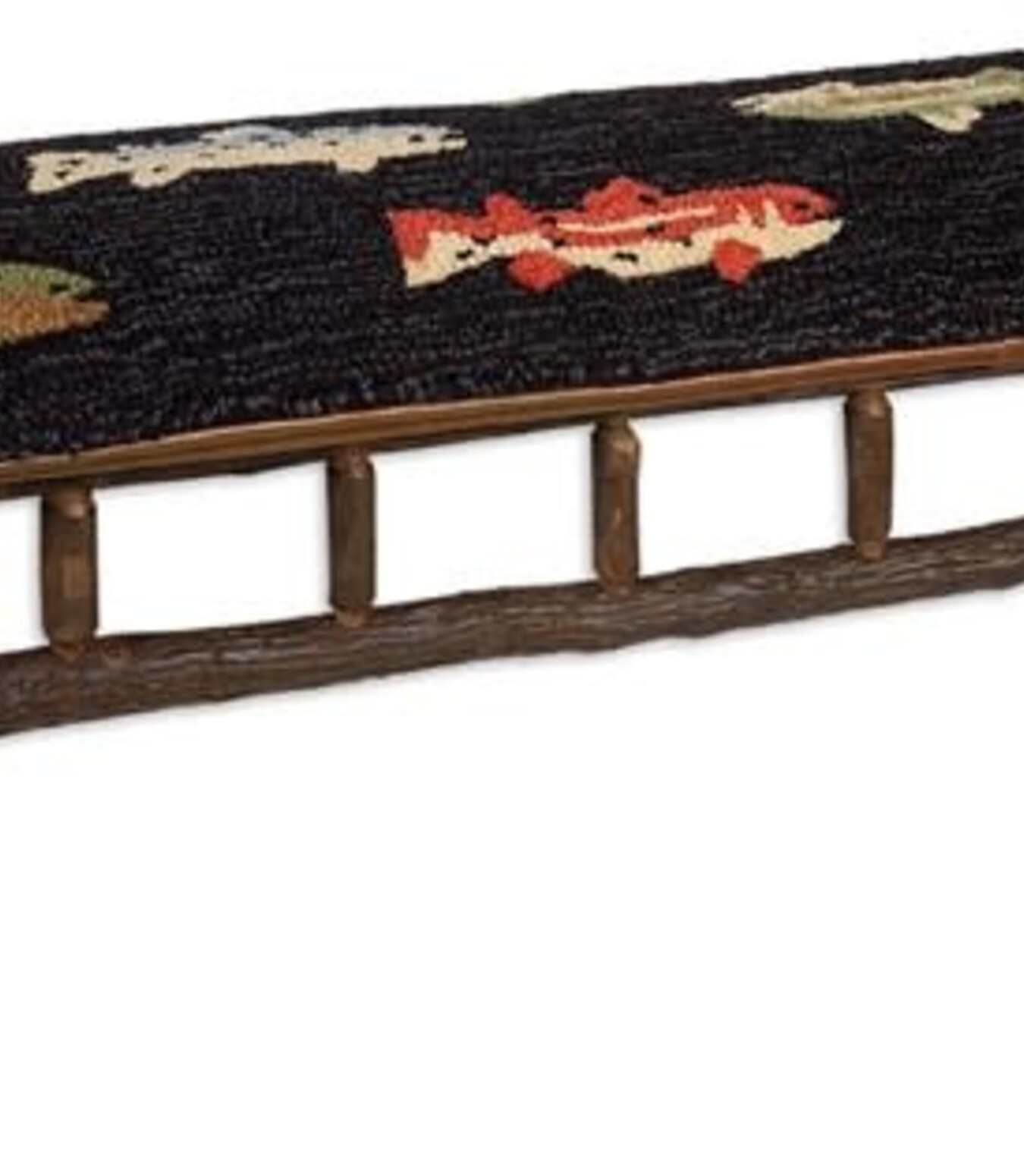 Relax on this hand hooked wool bench that displays a collection of river trout.
