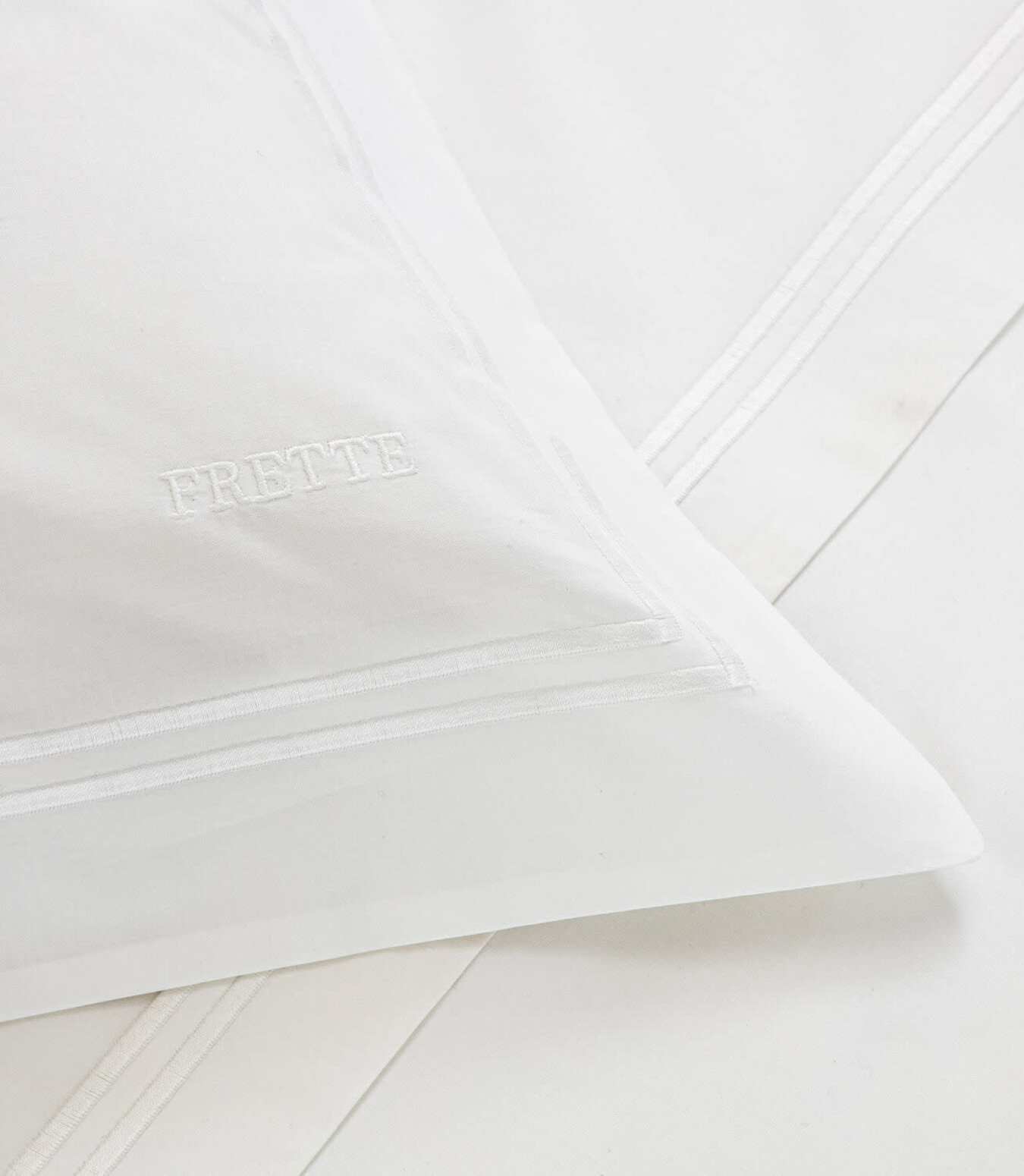 The Hotel Classic Sheet Set from Frette is composed of crisp cotton percale and features a top sheet and pillowcases embroidered with two distinctive borders. Subtle colours effortlessly complement every bedroom interior.