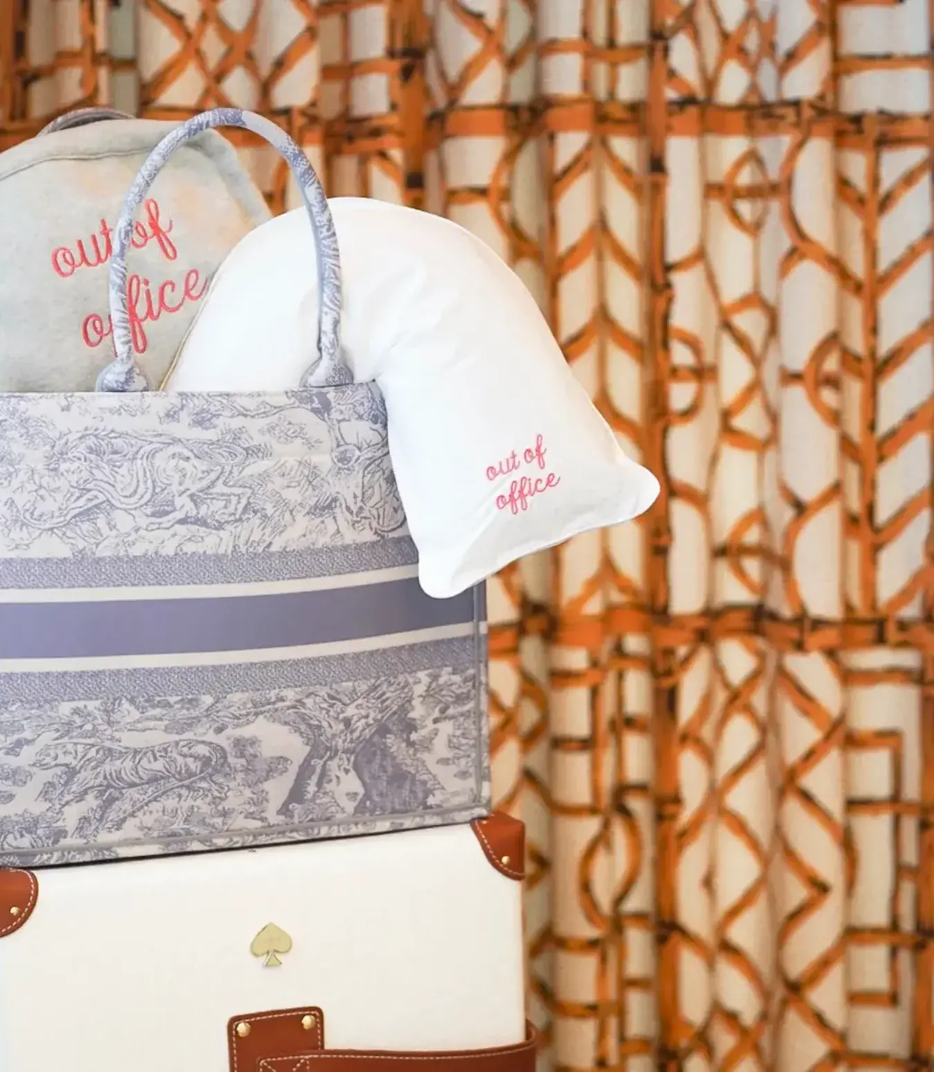 Inside, discover the Jetsetter Mini® travel pillow, satin-lined eyemask and heather grey oversized cotton throw, elegantly trimmed in ivory.