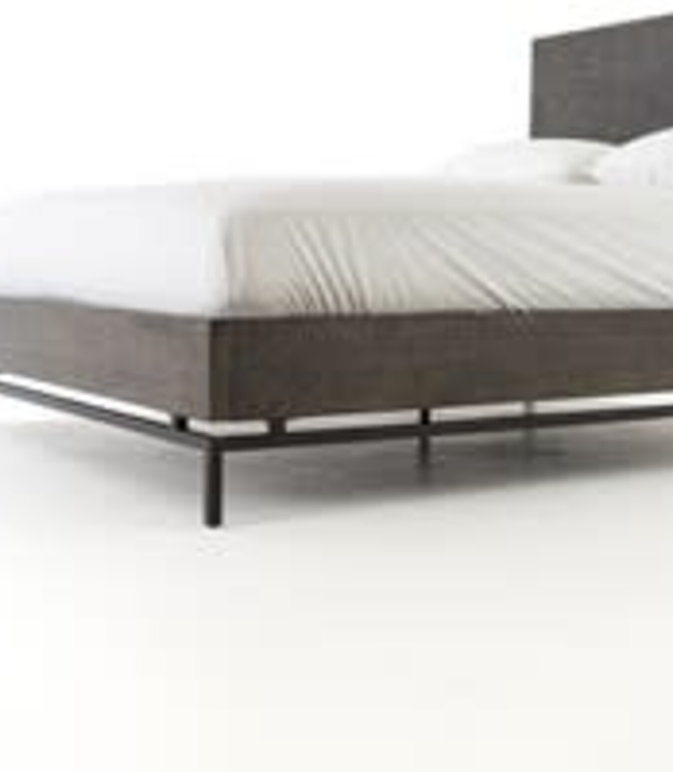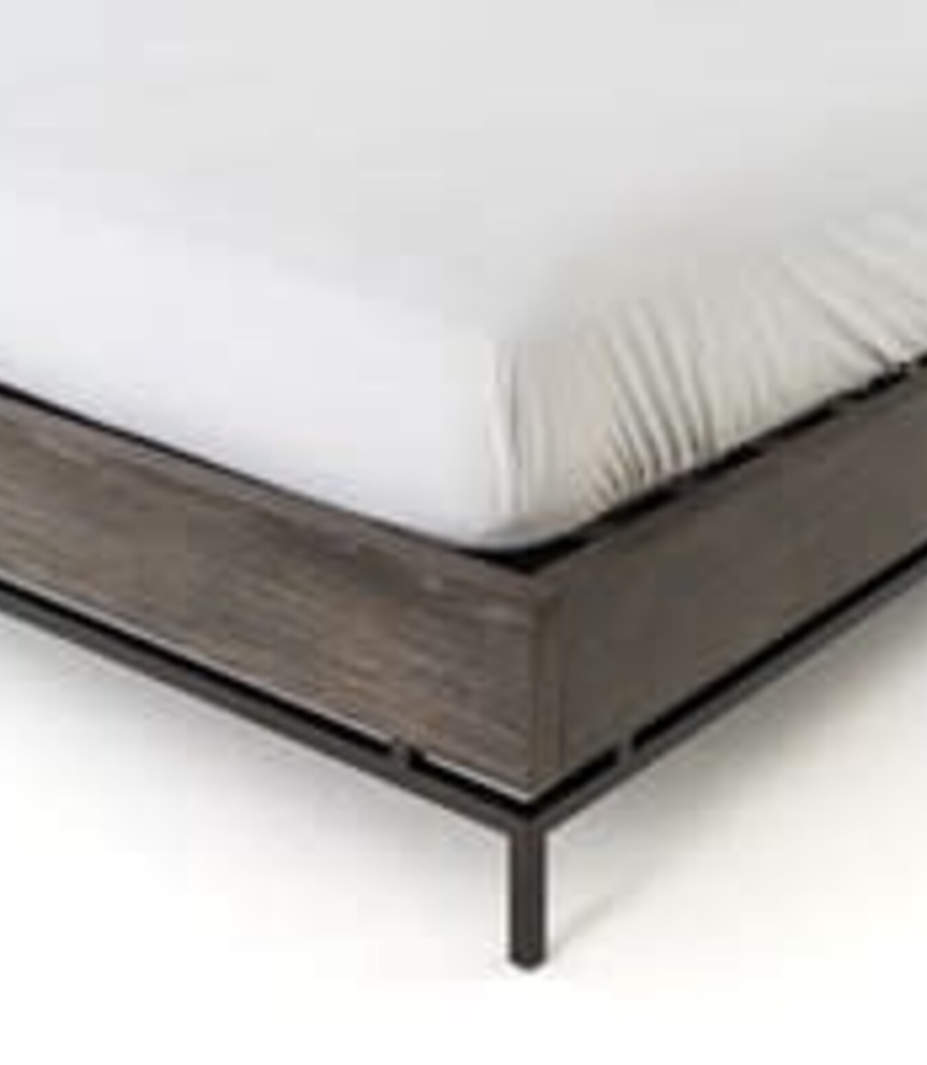 A floating iron base lightens the depth of rich, grey-finished oak, as clean lines lend a tailored look to warm rustic tones.