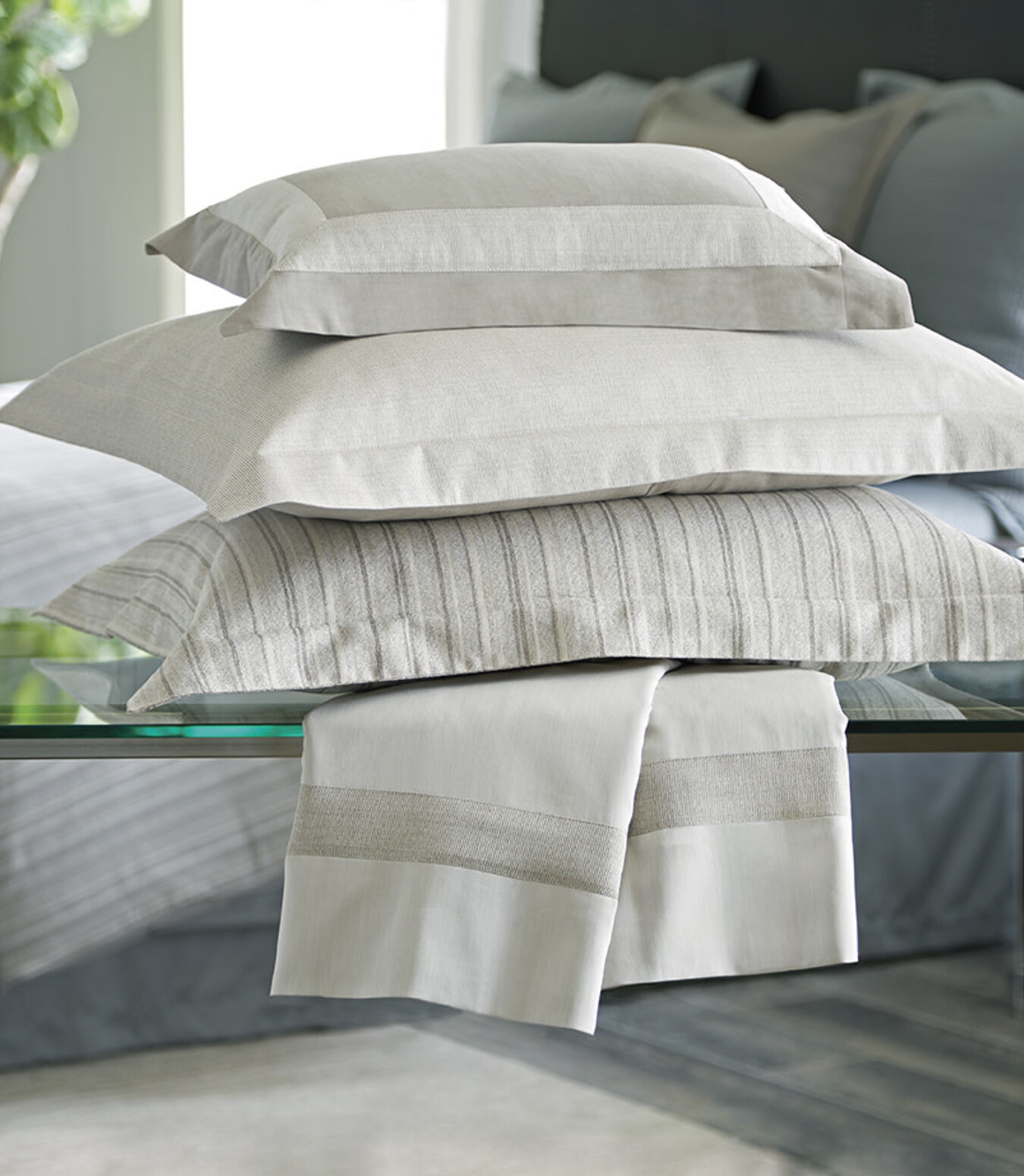 Leonardo Duvet Covers are double-sided, with Wide Stripe reversing to Narrow Stripe, and finished with a knife edge, four corner ties and button closure.