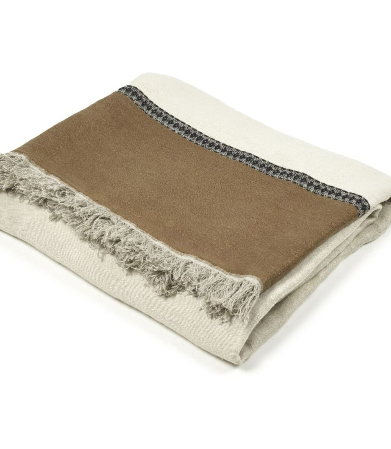 We photographed it with the Tack and Canal stripe bed linen, and it also works with the Tahoe stripe, so there are lots of mix and match options. There are two ginger, black and bone coloured stripes, one near the top and the ot