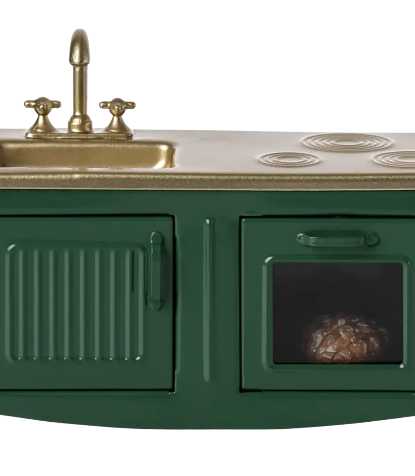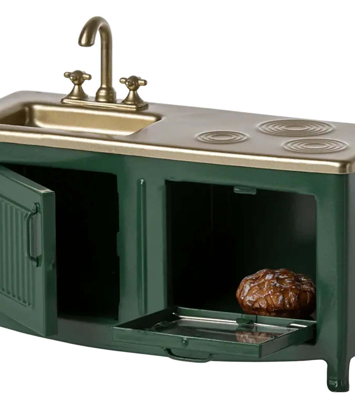 The kitchen is the heart of every home. This kitchen's has many playful details such as the pleasant hue and subtle details like the cabinets, sink, and oven with freshly-baked pie. It's the perfect size for the mouse family.