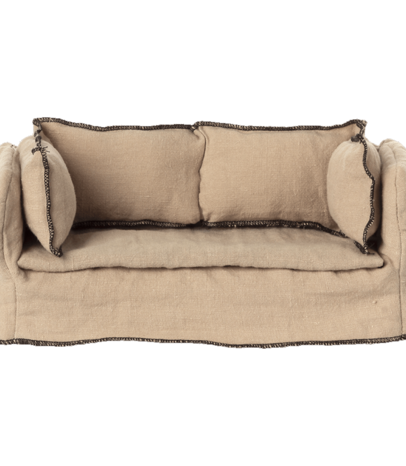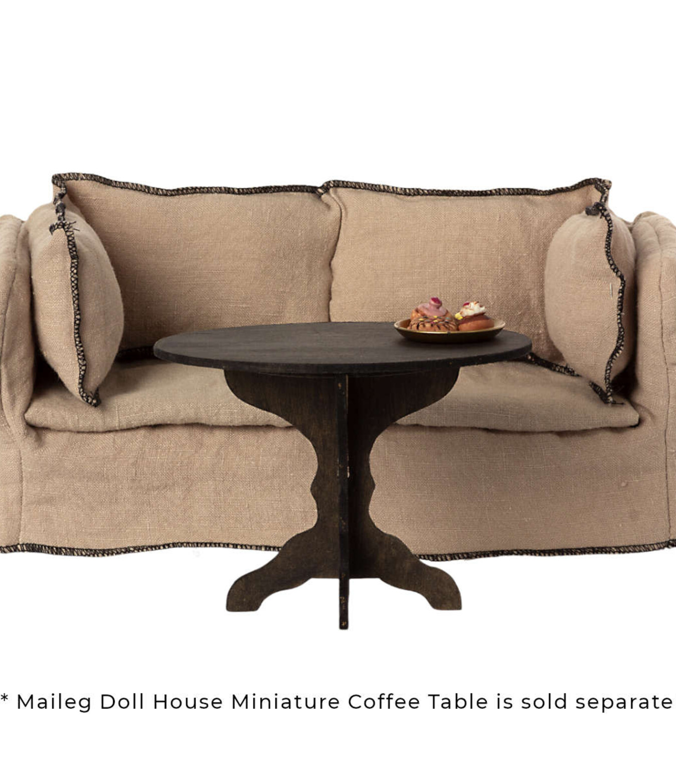 Comfy linen fabric couch with FSC Wood structure for the Maileg House of Miniature Dollshouse. This lovely sofa with padded cushions works perfectly with the miniature coffee table and is suitable for the Maileg Size 1 Bunny/Rabbit, Teddy