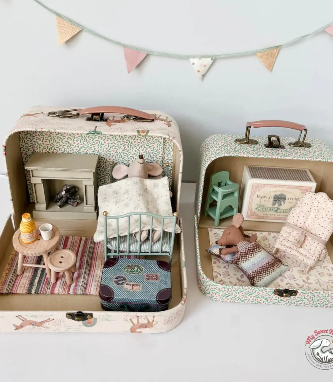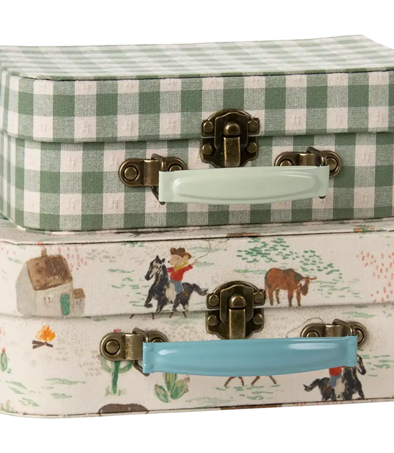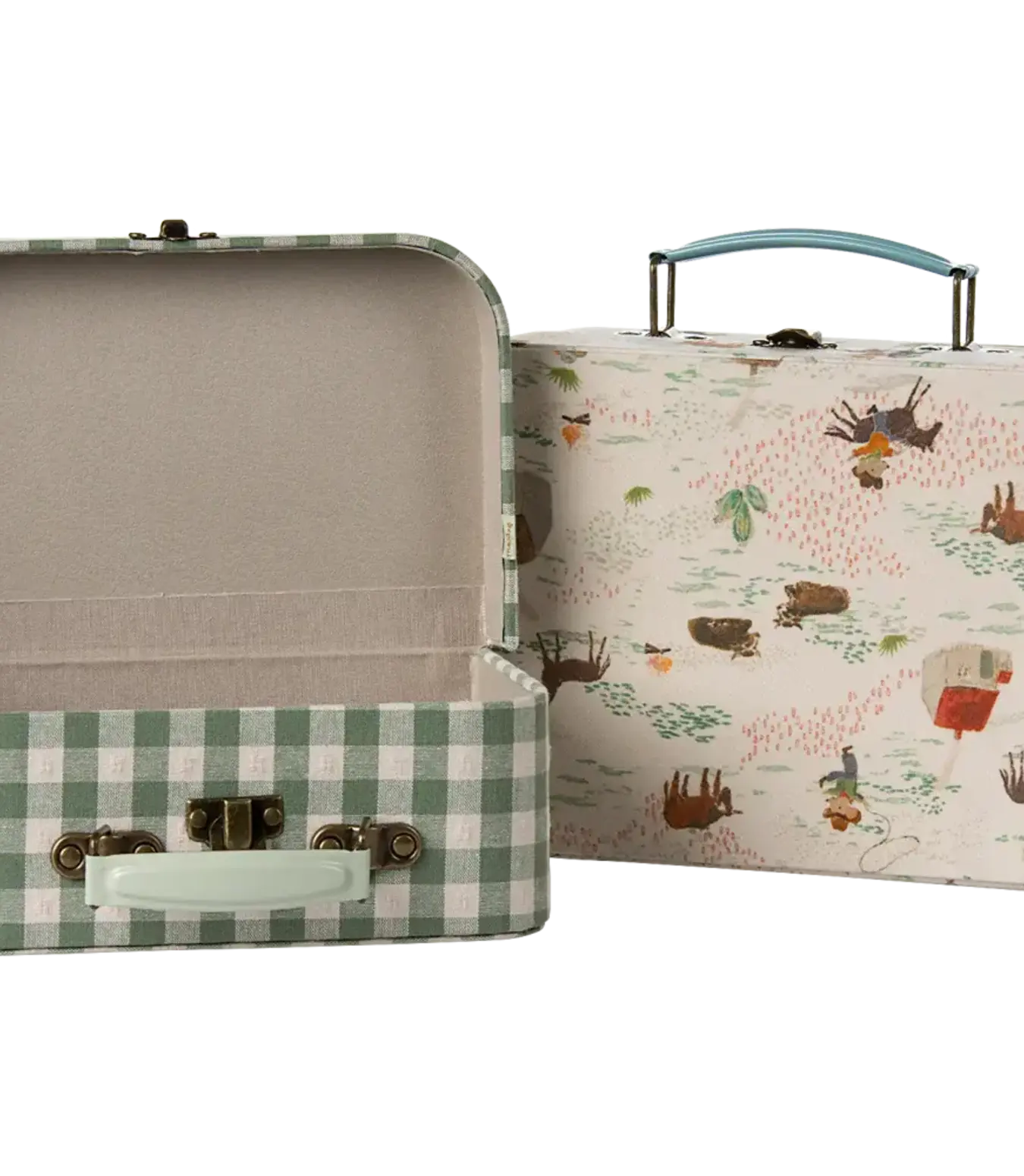 A perfect suitcase set to store all your favorite items. Each suitcase is covered by unique Maileg fabrics and has colored metal handles. This 2 pcs set is perfect for storage and for carrying your favourite toys.