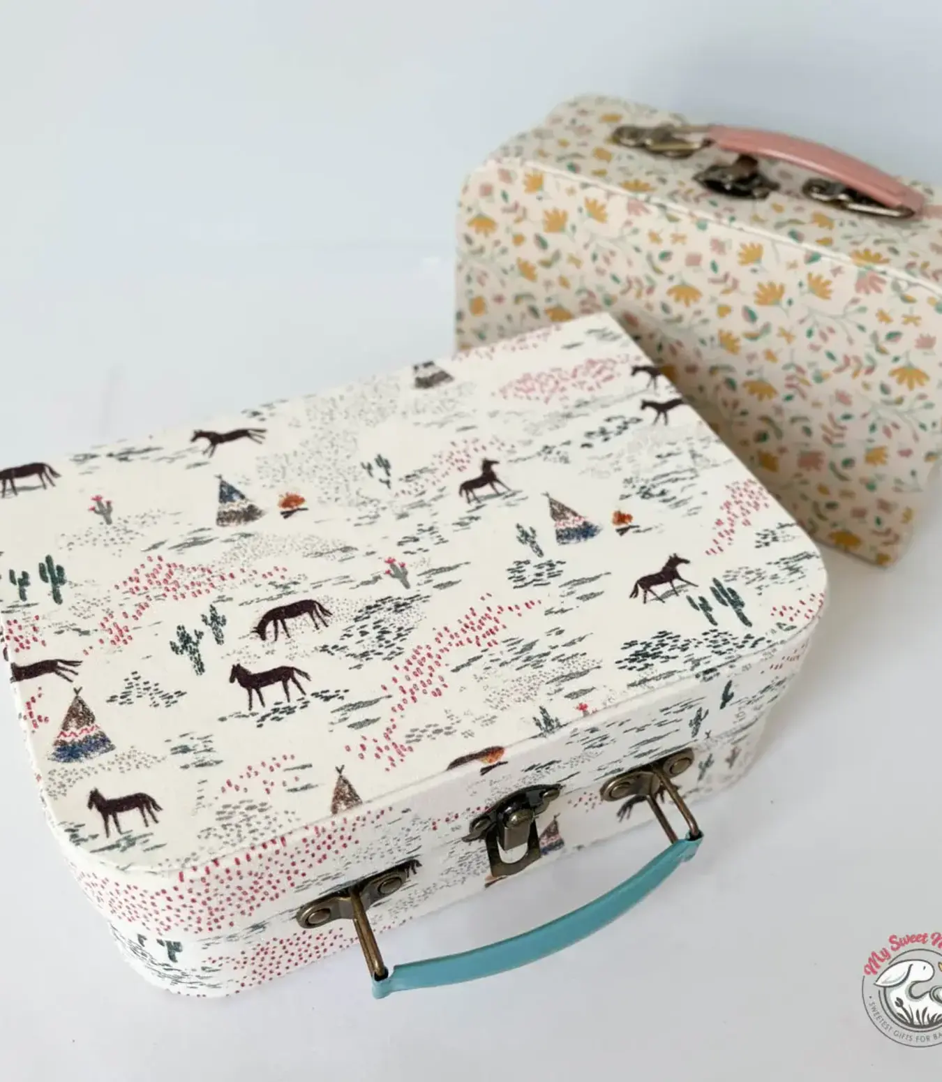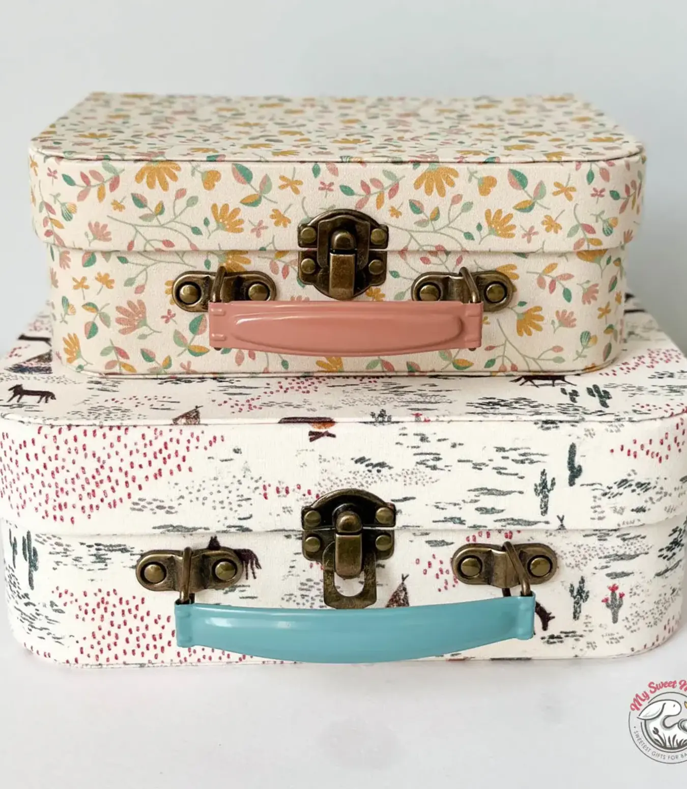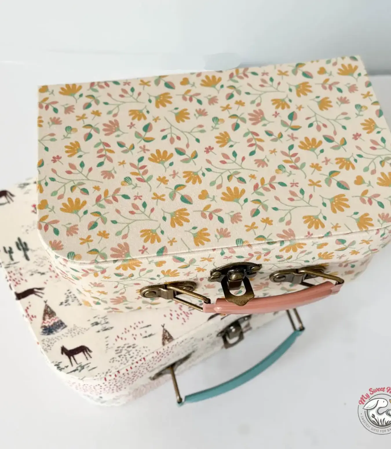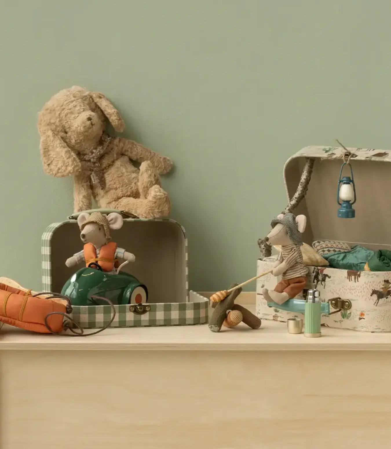 A perfect suitcase set to store all your favorite items. Each suitcase is covered by unique Maileg fabrics and has colored metal handles. This 2 pcs set is perfect for storage and for carrying your favourite toys.