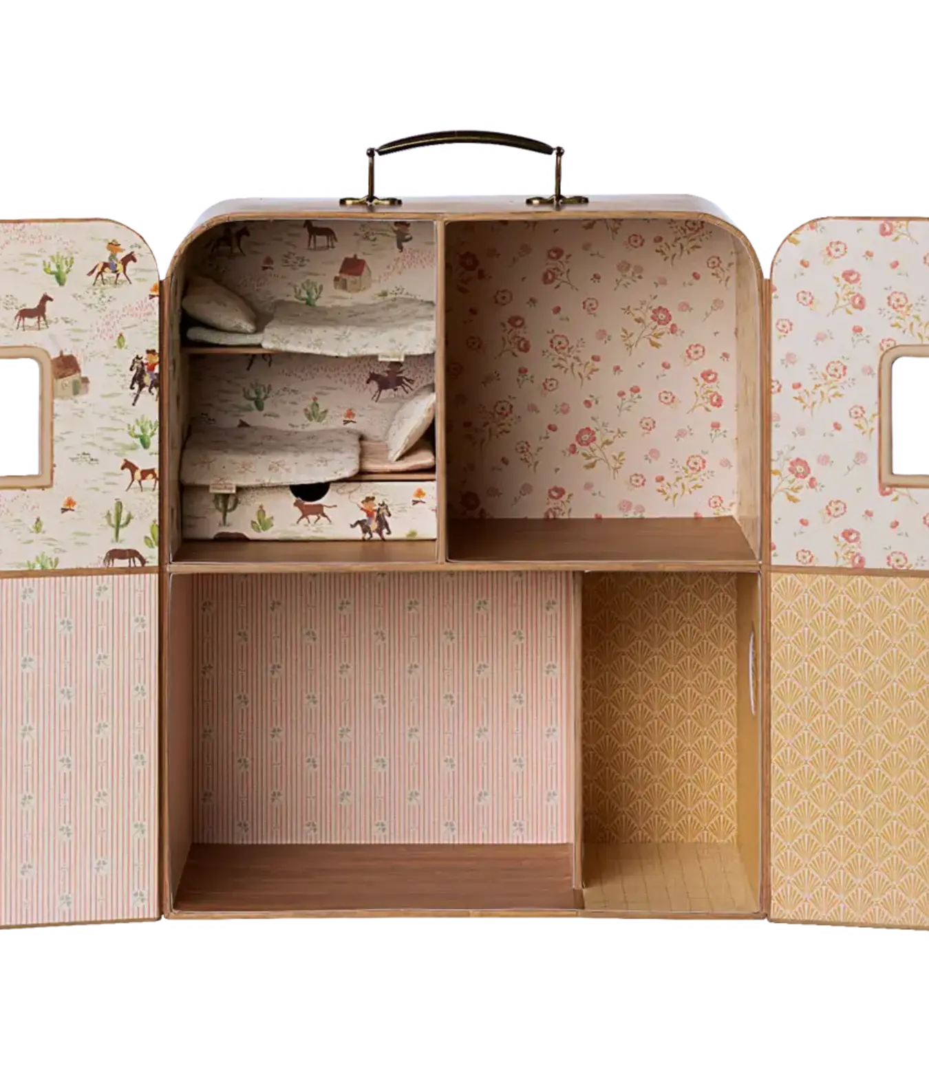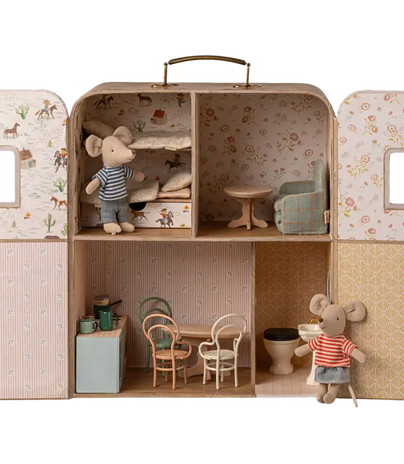 Welcome to the SuitCasa, a charming portable mouse house perfectly sized for Little Brother and Little Sister mice. With a convenient handle, it transforms into a suitcase when the magnetic doors are closed, making it easy to take your mice on adventures.