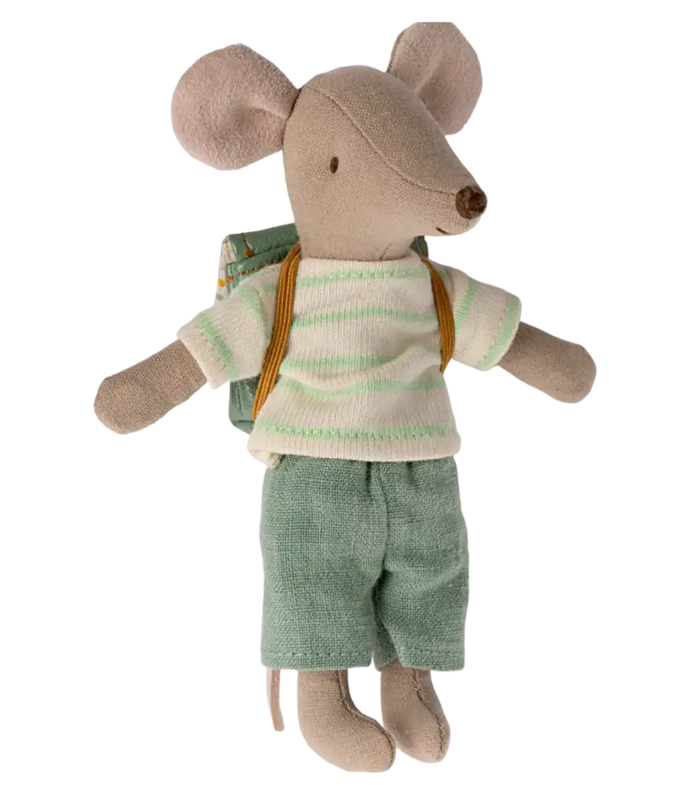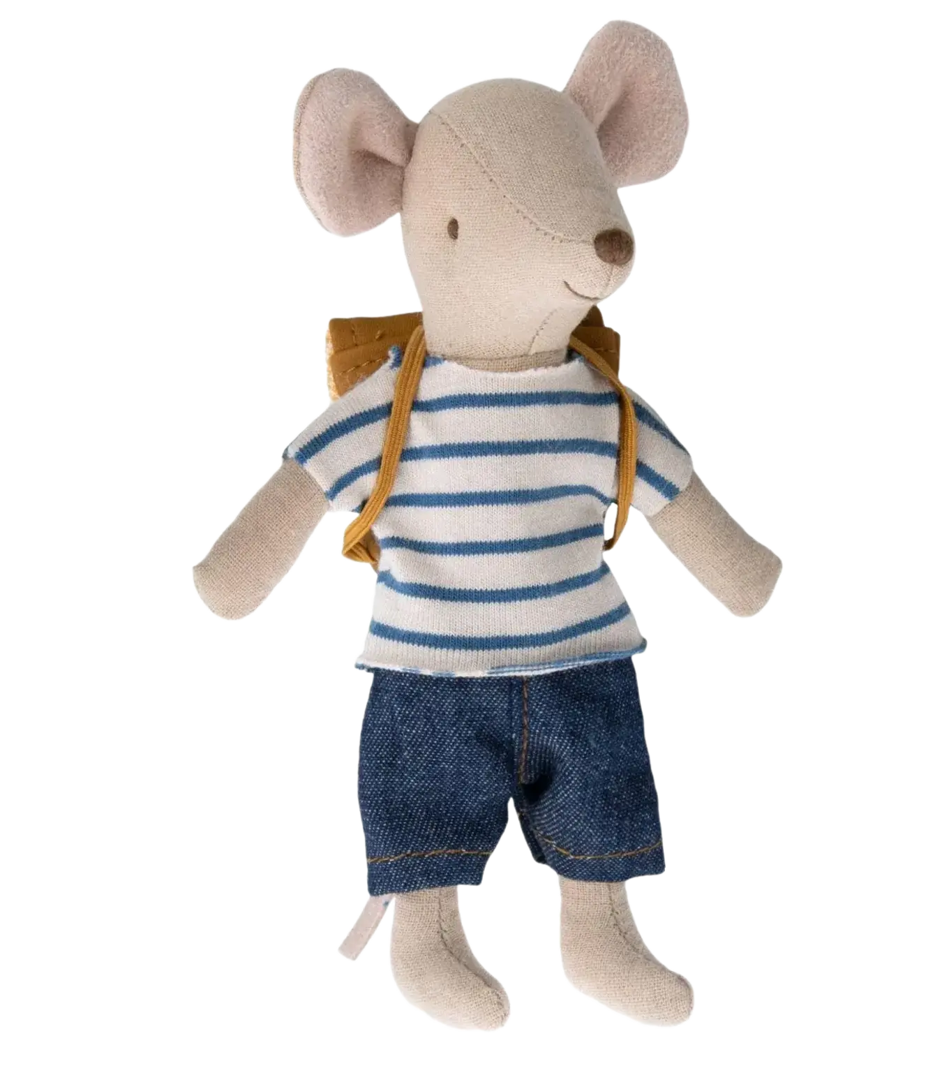 Big Brother Mouse is dressed for a day at school, carrying his backpack along with him. He has magnets in his hands so he can hold the handles of the tricycle when he rides quickly home from school.
