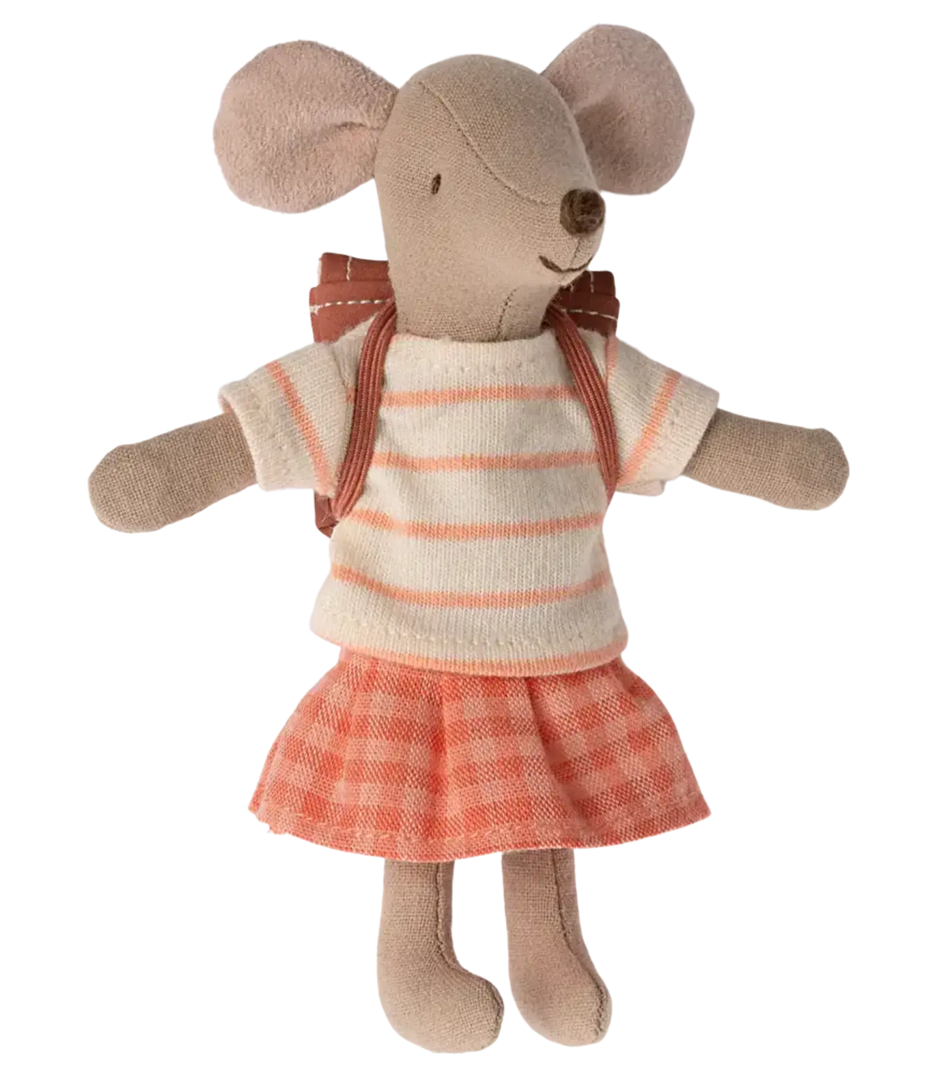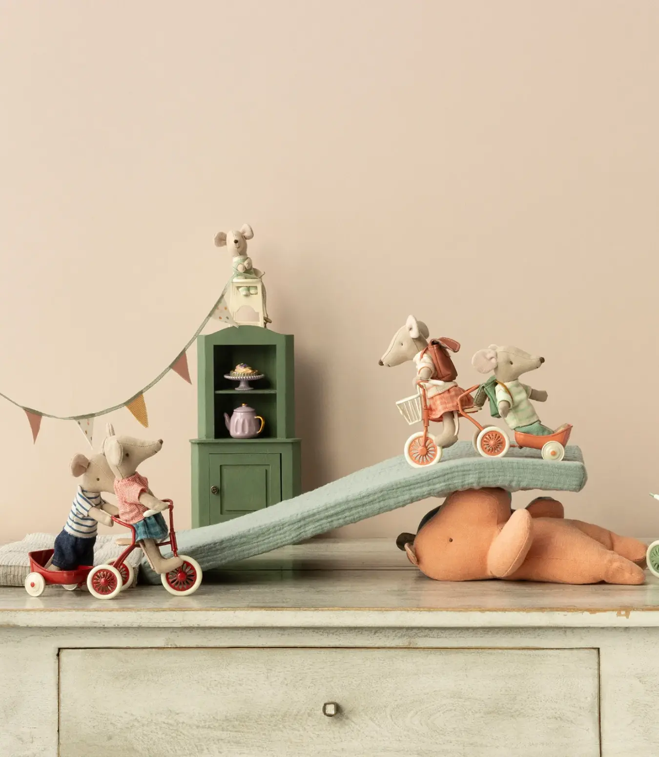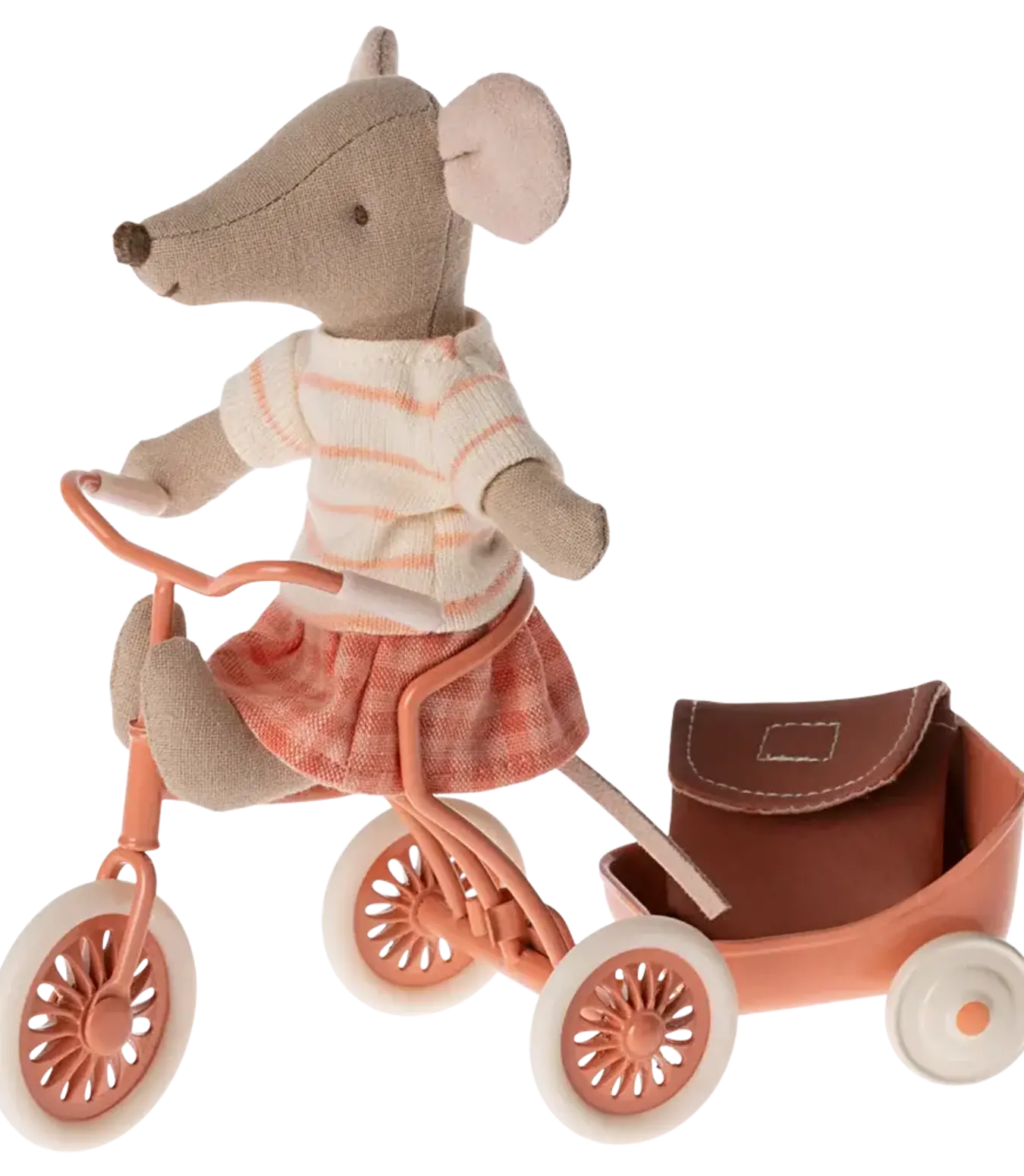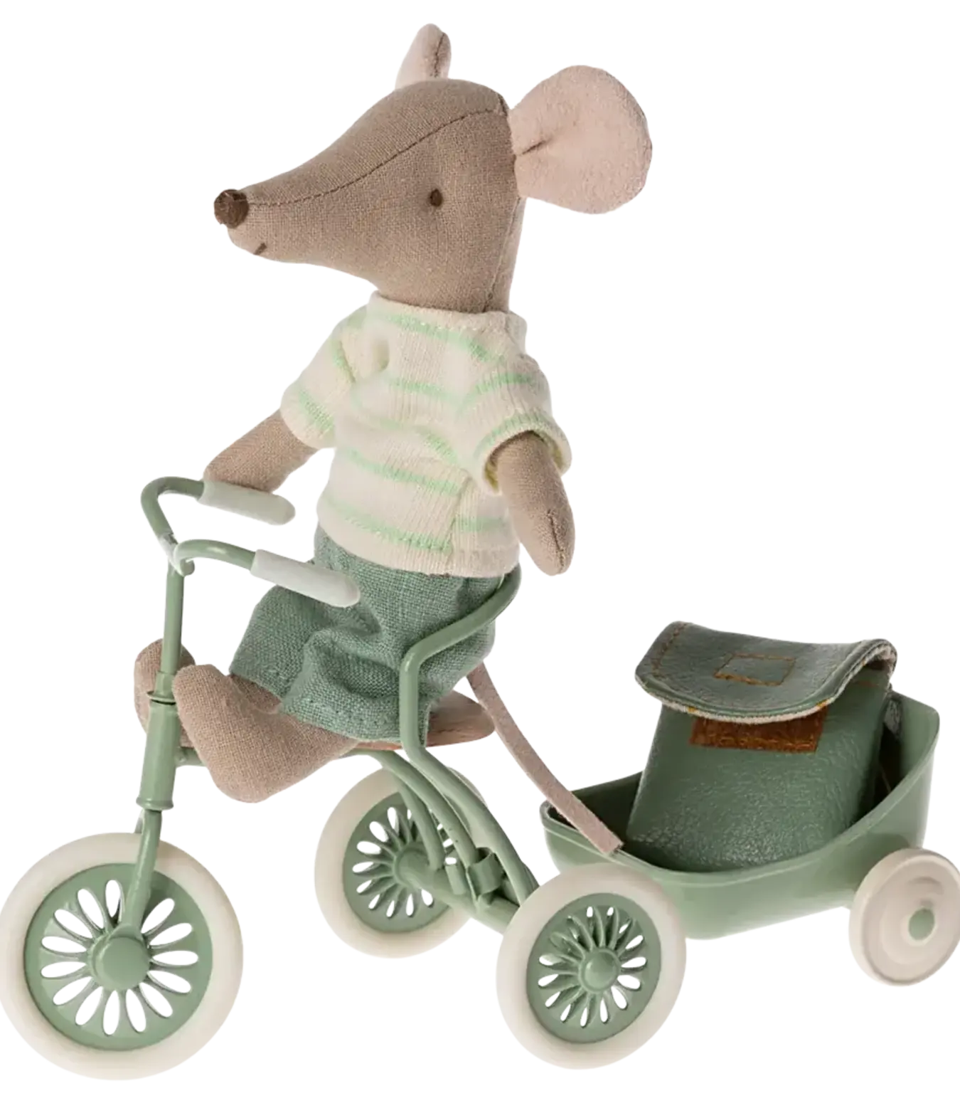 A big sister or brother mouse is dressed for a day in kindergarten or school as they are bringing their backpack. Tricycle mice have magnets in their hands so they can hold the tricycle handles tight for the fast trip.