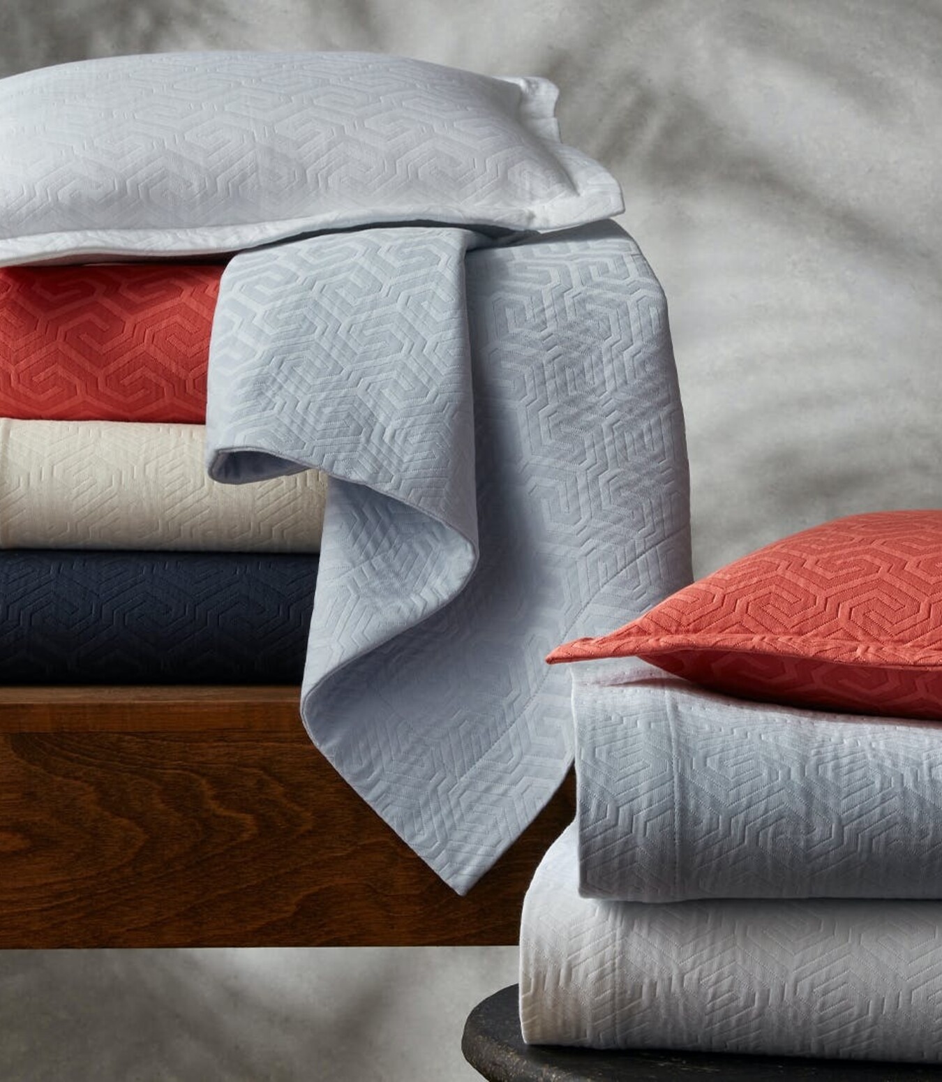 With an inviting, relaxed hand, Athena is a woven matelassé featuring fretwork inspired by an archival Schumacher upholstery fabric. It's luxurious multi-dimensional quality and pliable softness are ideal for versatile layering.