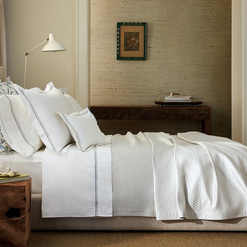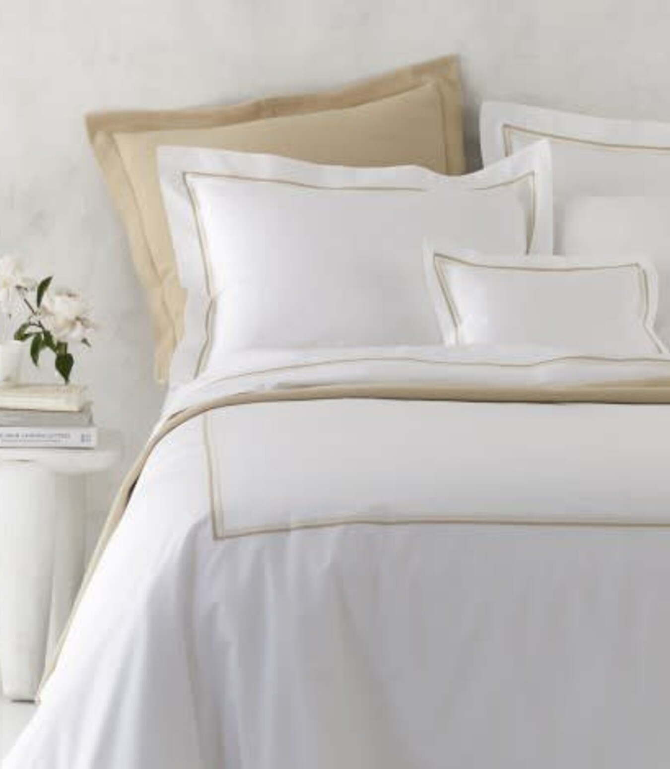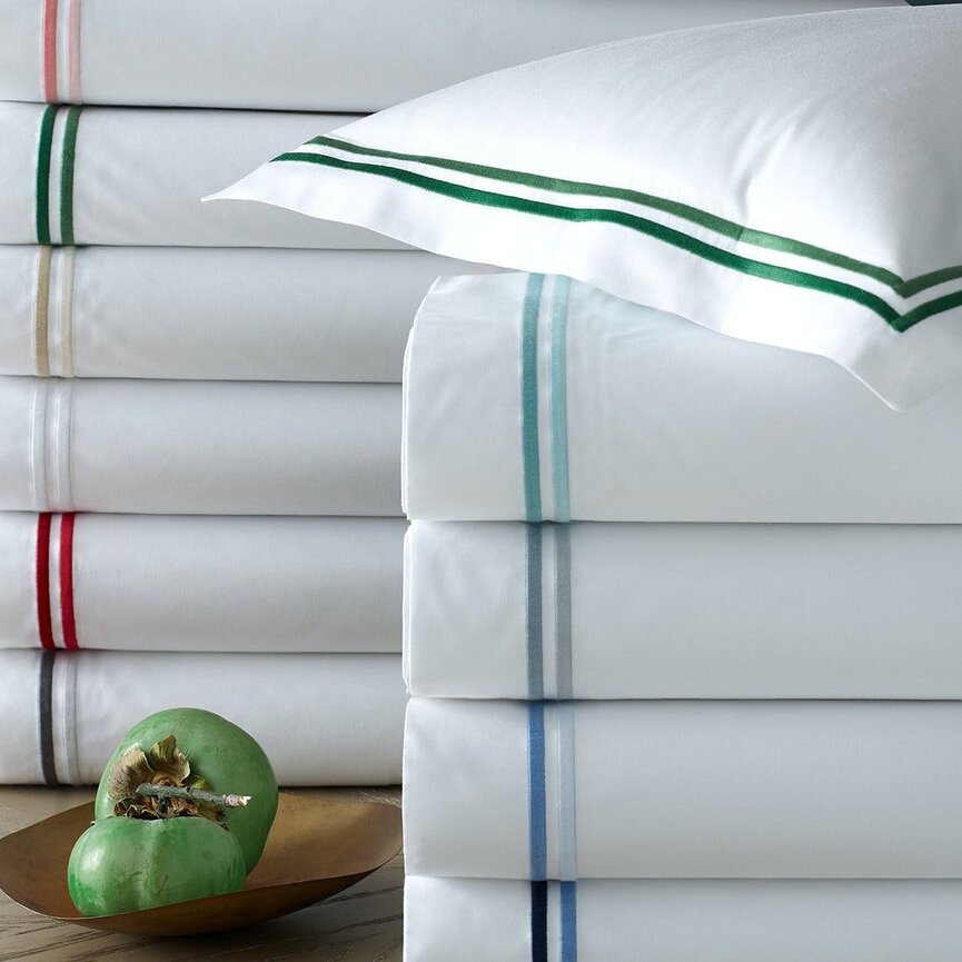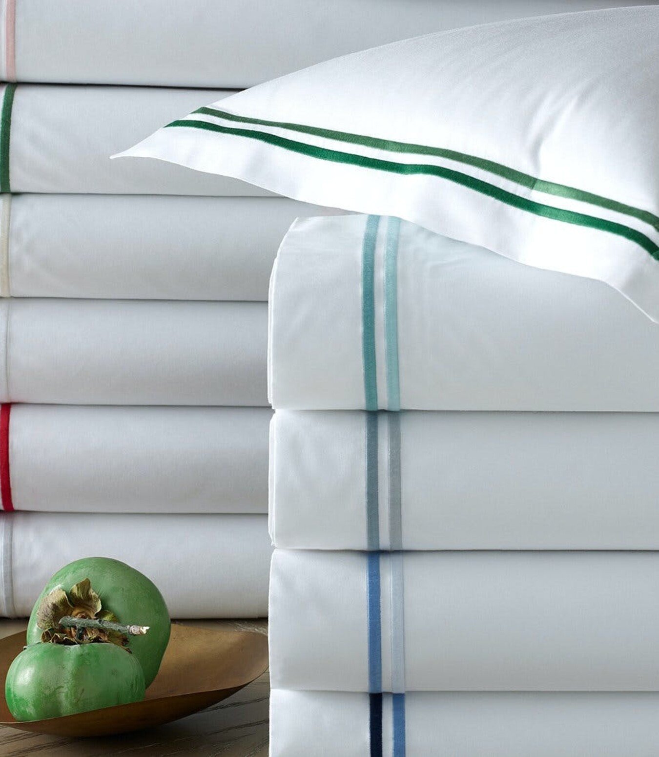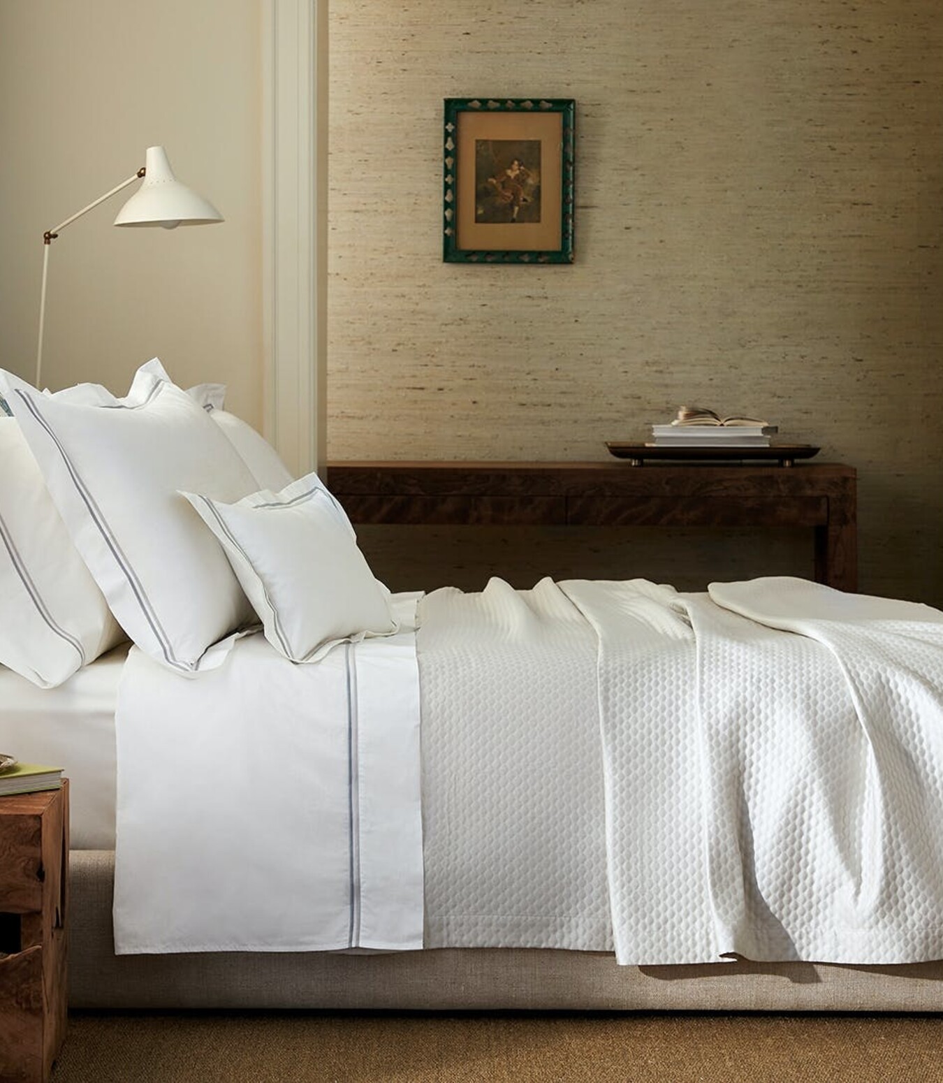 Essex brings two smart lines of satin stitch embroidery to our Sierra sheeting, in long-staple cotton percale. With tonal colors and crisp design, Essex adds a smart look to any bedroom.