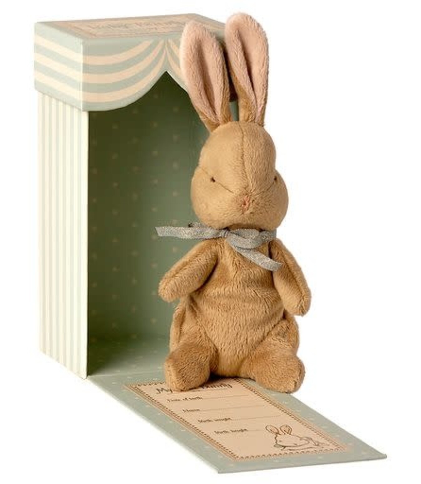 My first bunny is perfectly made for small hands. It is made in a soft plush quality and has a colored ribbon around the neck. It is packed in a beautiful gift box where you can add the birth information inside. This is the per