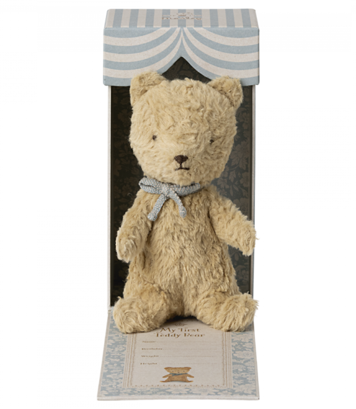 The perfect gift for any new born baby. The fabric is very exclusive and gives the small teddy bear a sweet classic vintage look. Ready to be loved for many years. You can write the name, date, height and weight of the baby on the in