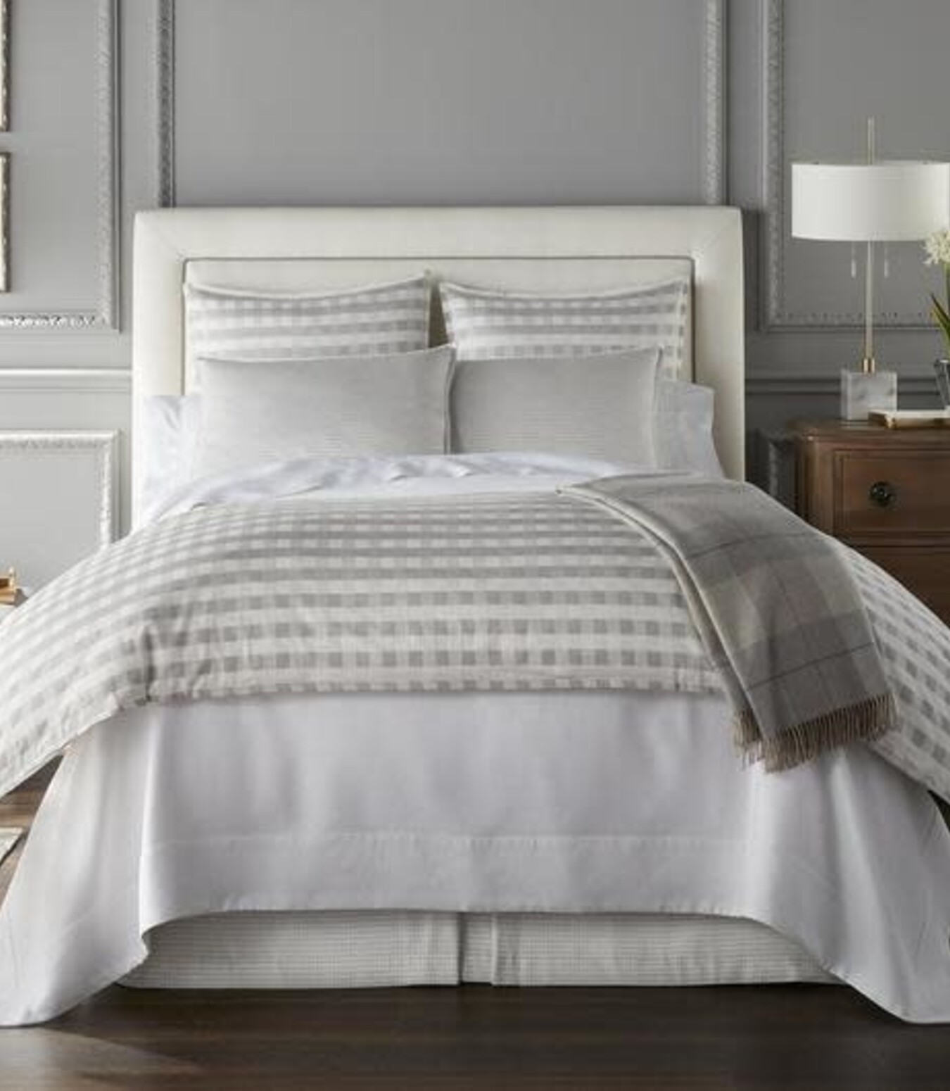 100% cotton. An updated twist on a classic checkered plaid design. Easily dressed up for high end master bedroom or dressed down for a casual look!