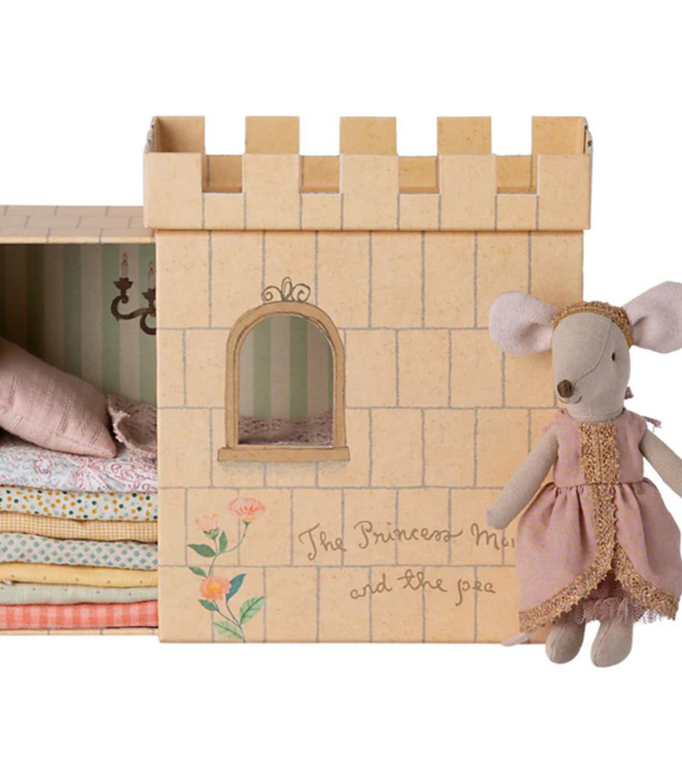 Become enchanted with the newest Maileg take on the Princess and the Pea! This Princess, who wears a stunning blue and gold sparkle dress, comes in a keepsake castle box that slides open and closed. Just like in the story, the princess mouse still feels the pea even with the many mattresses that come in this cute set... how charming!