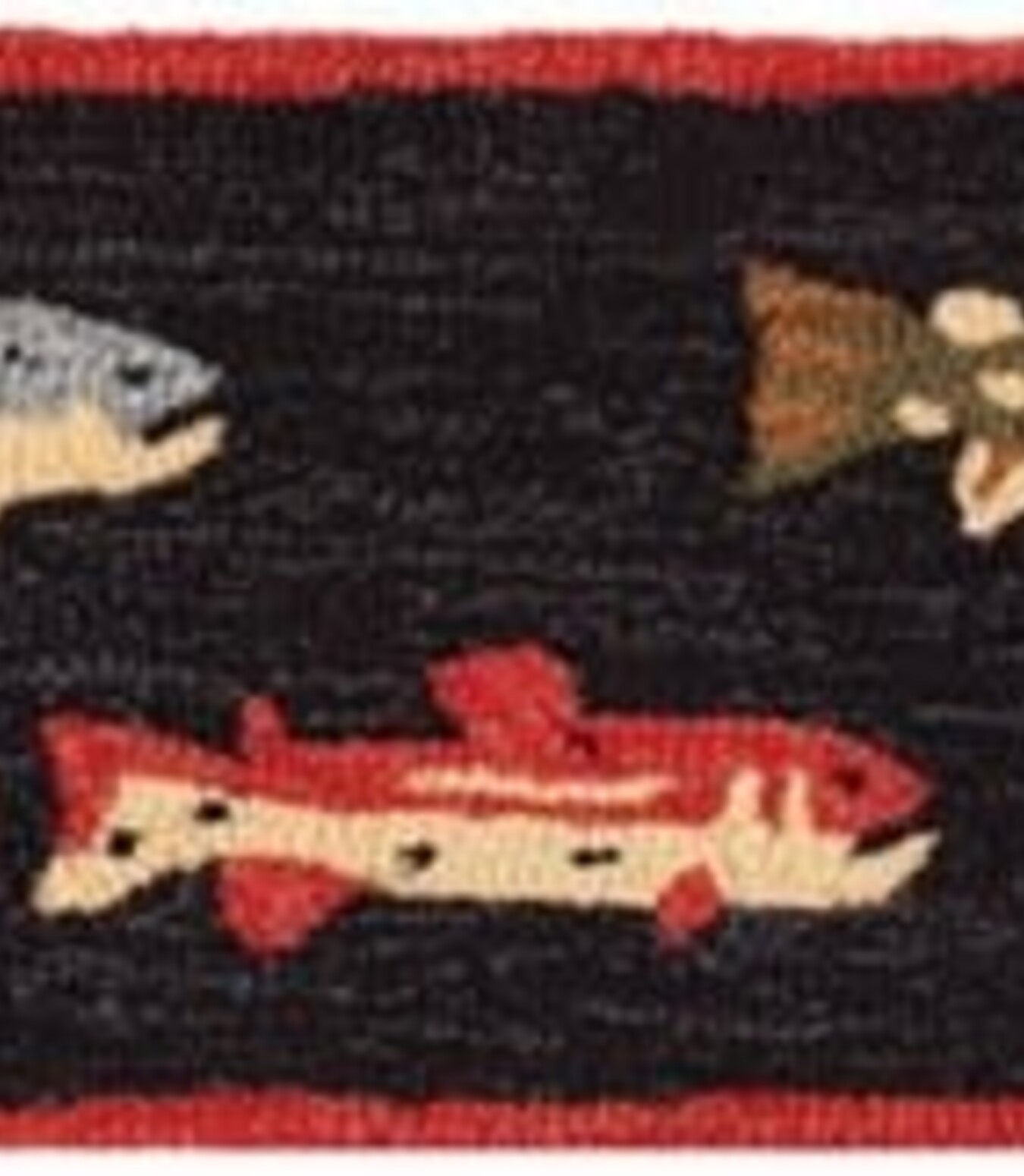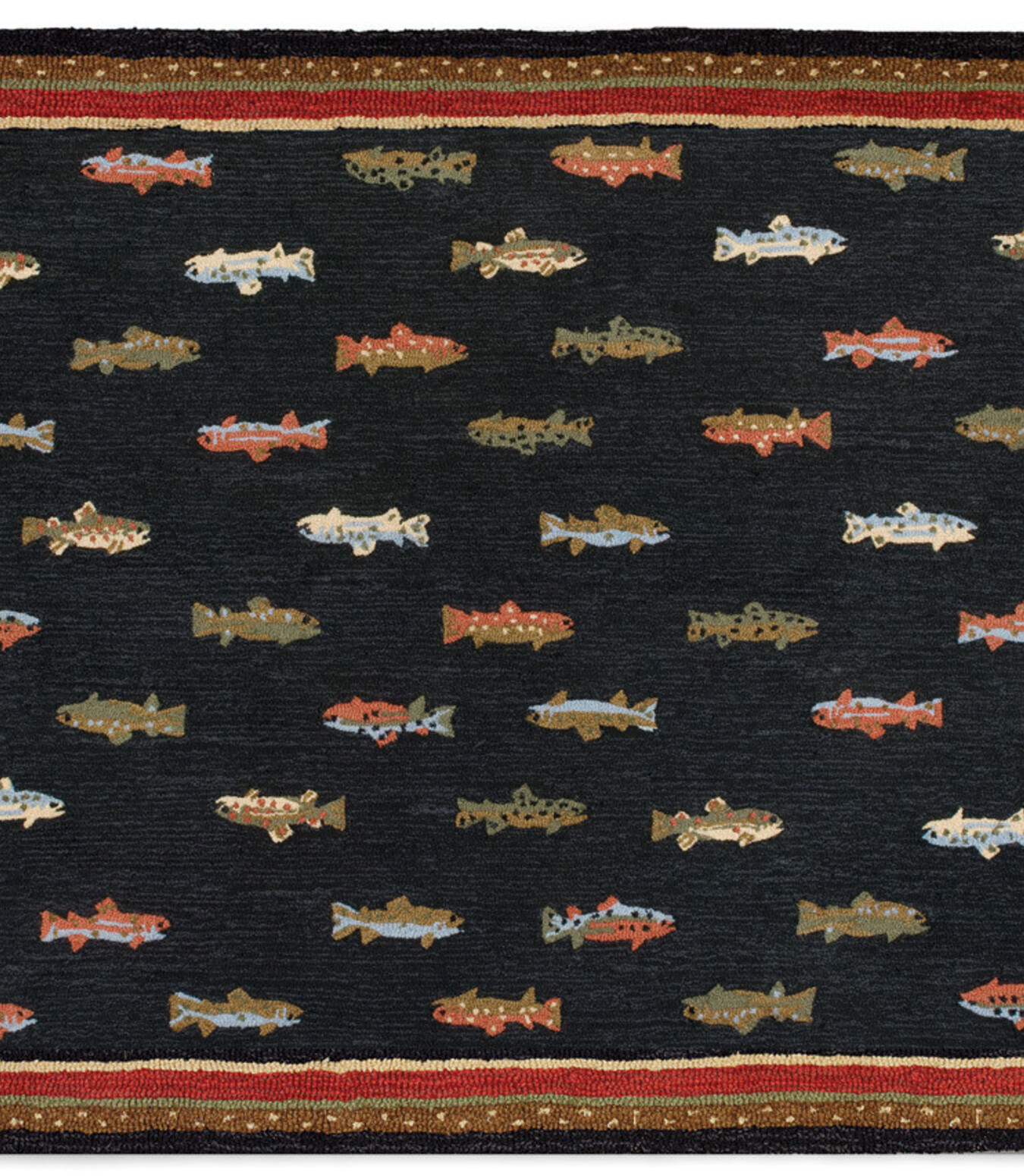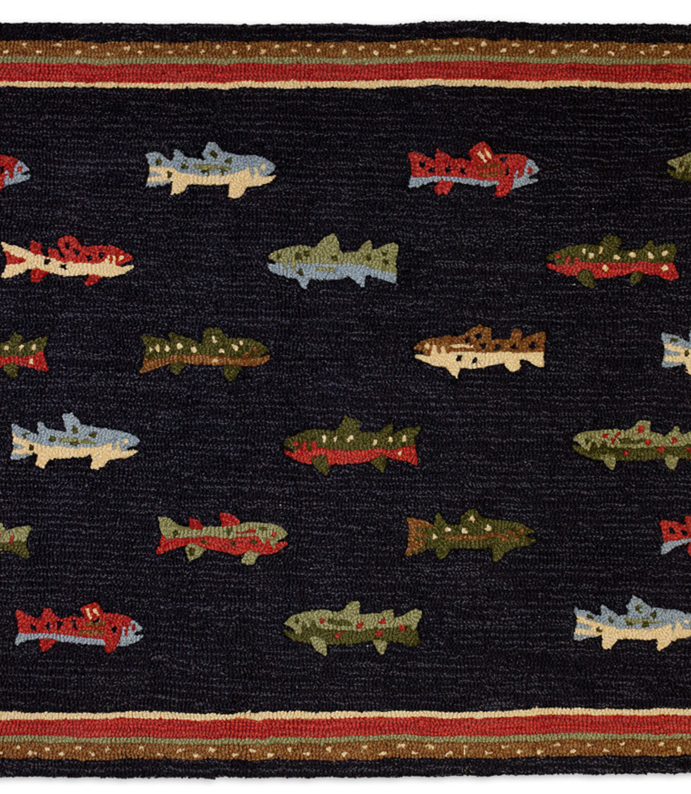 A sampling of river fish dot our favorited hooked rug. A perfect addition to your waterfront home.