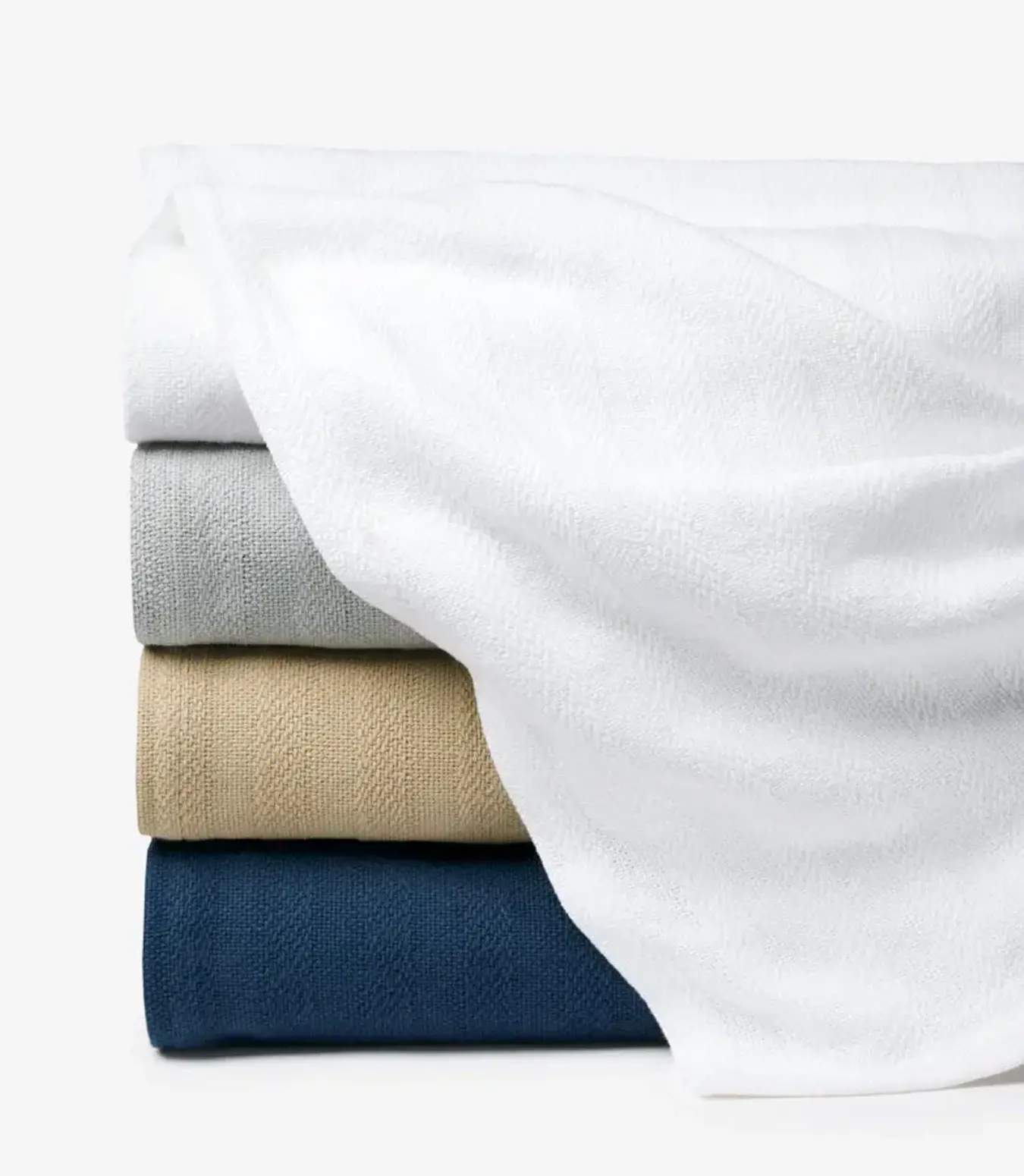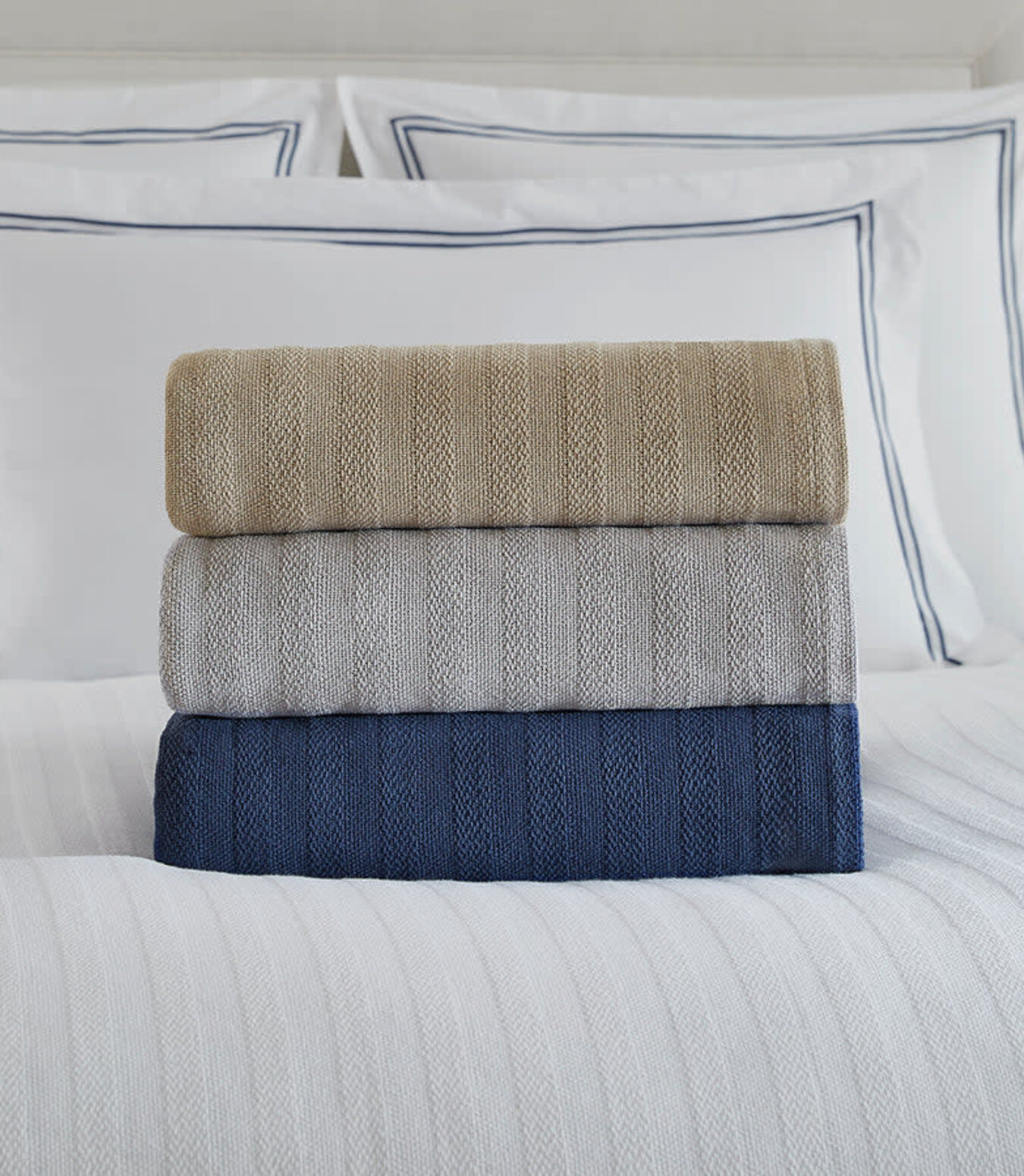 Offered in neutral hues, Tavira’s tonal woven stripes add texture and elegance to this cotton blanket's lightweight warmth and year-round versatility.