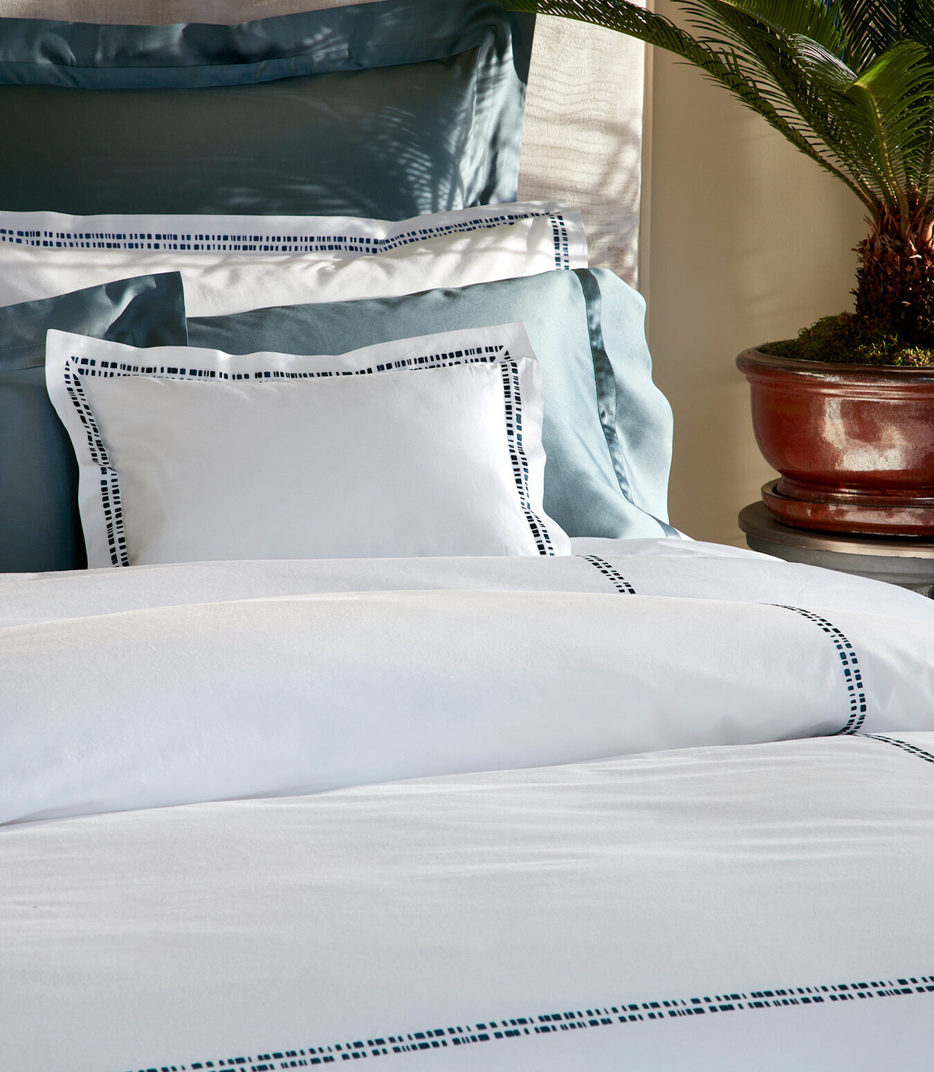 This new embroidery joins classic European detail with the latest finishing techniques. A cubist pattern in slightly iridescent thread is placed on the angle, not the face of the sham--creating a fresh, sophisticated companion to any of our beds.