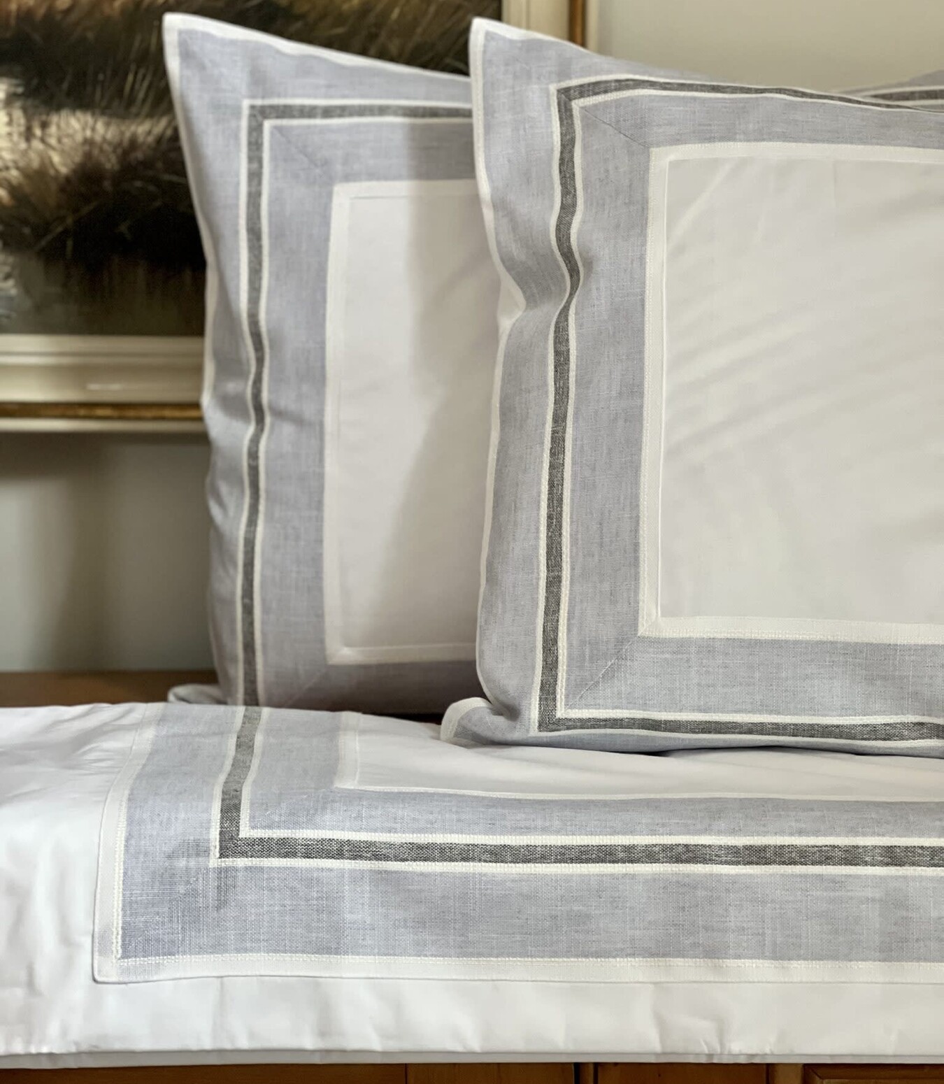 Tenerife application is a sophisticated choice in Taupe or Blue on our cotton base sheet. Base sheeting offered in White, Ivory or Eggshell in Sateen or Percale. Made exclusively for TL at Home in Portugal.