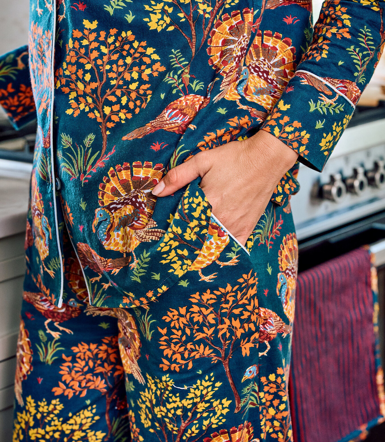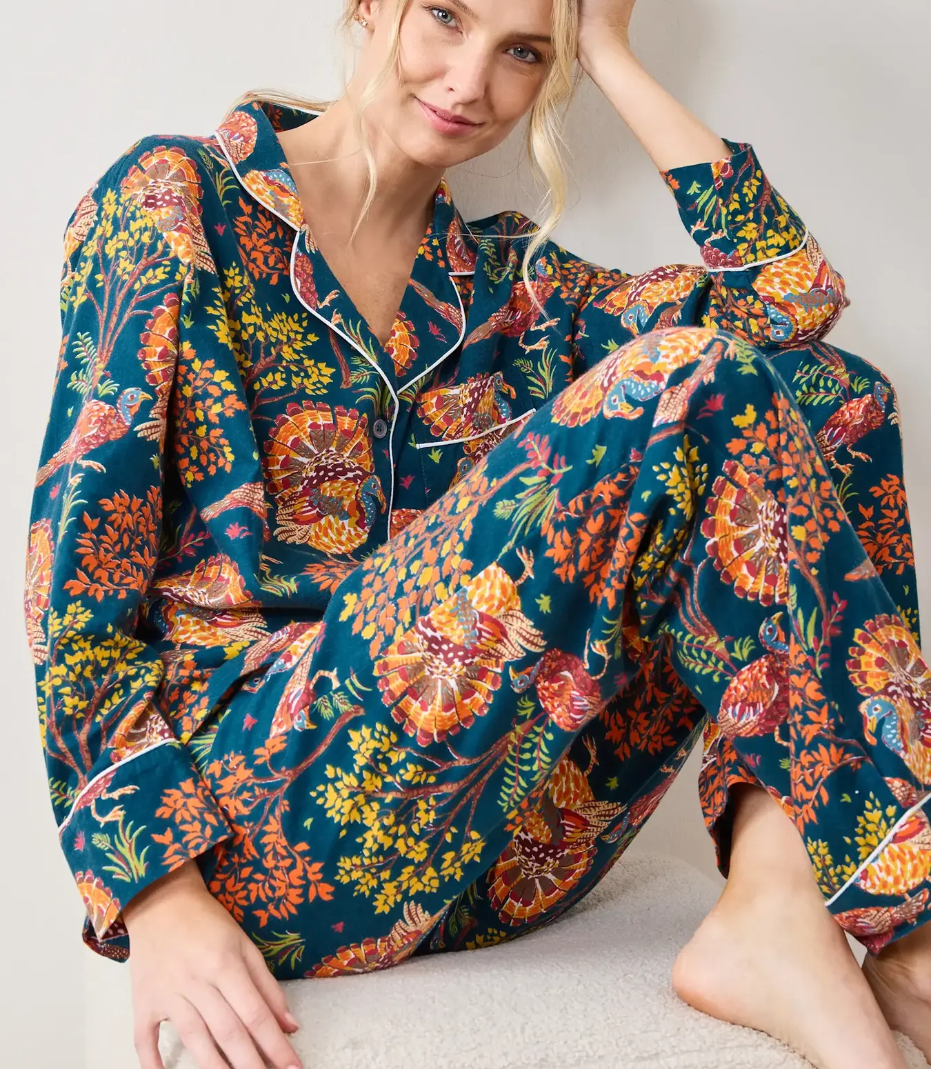 Strut into the season with our Turkey Trot flannel pajama set in rich Midnight Navy. This whimsical turkey print sleepwear features festive birds wandering through autumn foliage on breathable, lightweight flannel. The roomy button-down top and comfortable pants with pockets make these fall pajamas perfect for post-feast lounging and crisp mornings.
