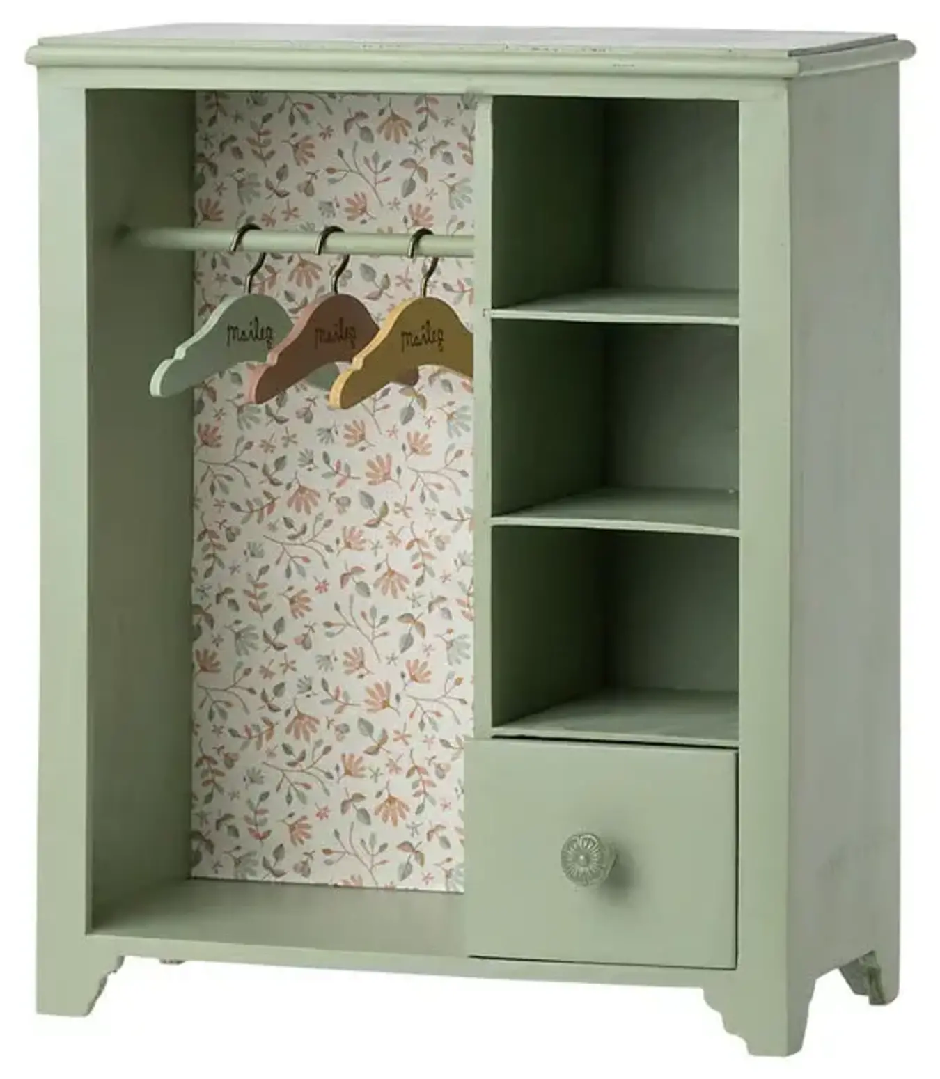 This wardrobe will make sure your Maileg friends have a place to put their clothes and accessories. The backwall inside is covered with a beautiful Maileg fabric. 3 small hangers in different colors are included. The extra clothing articles pictured are not included.