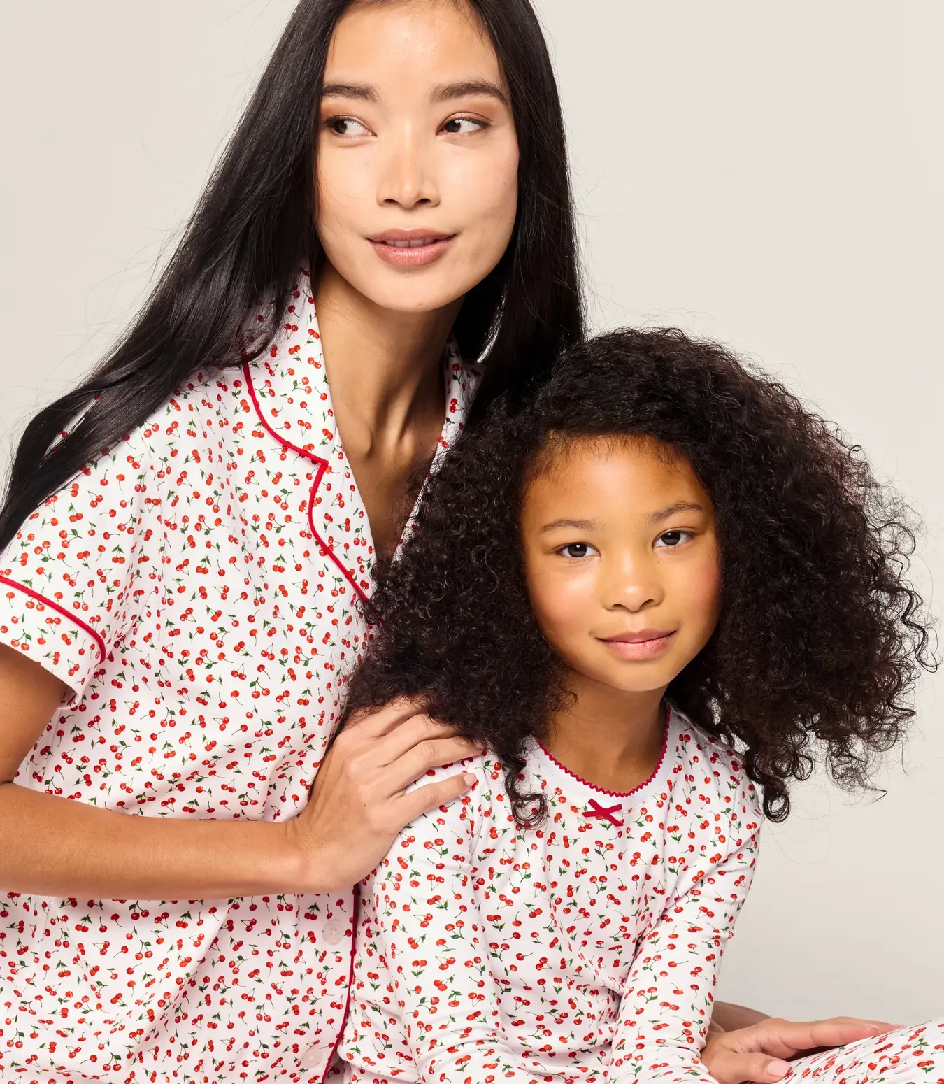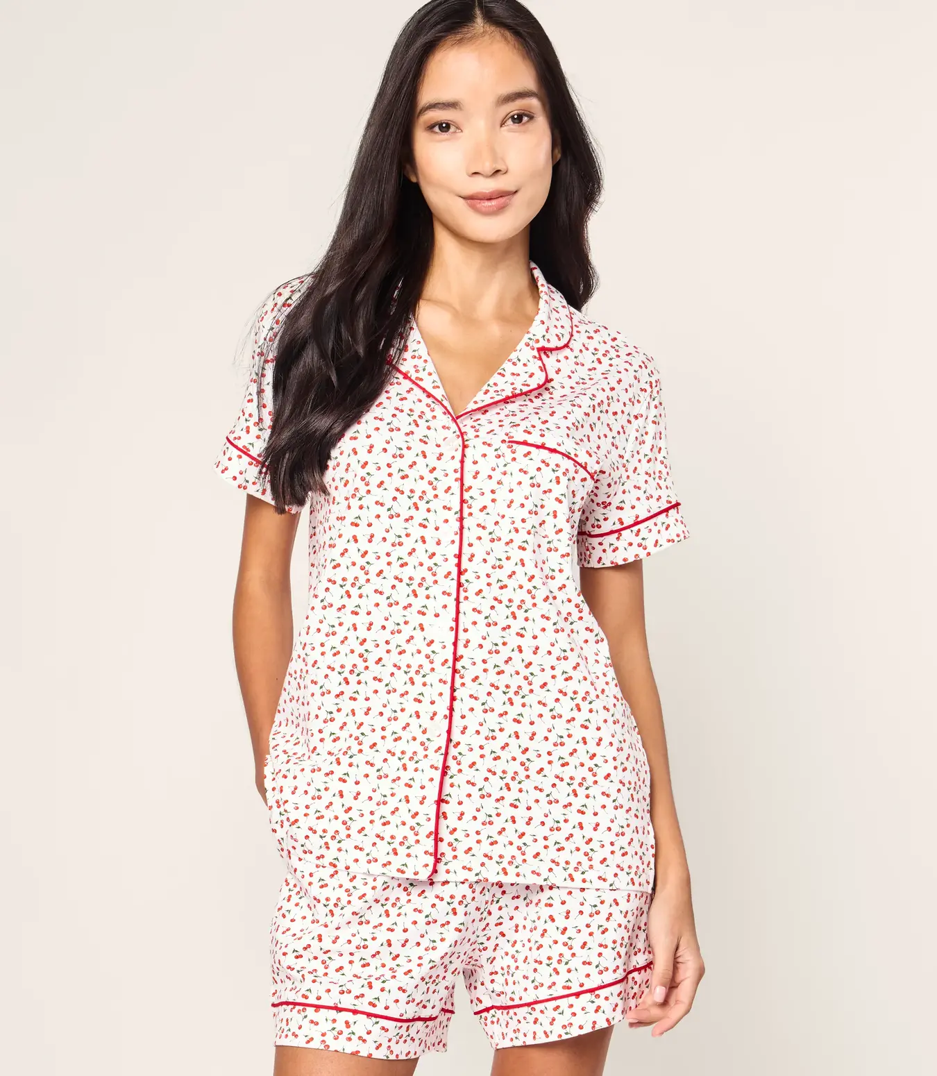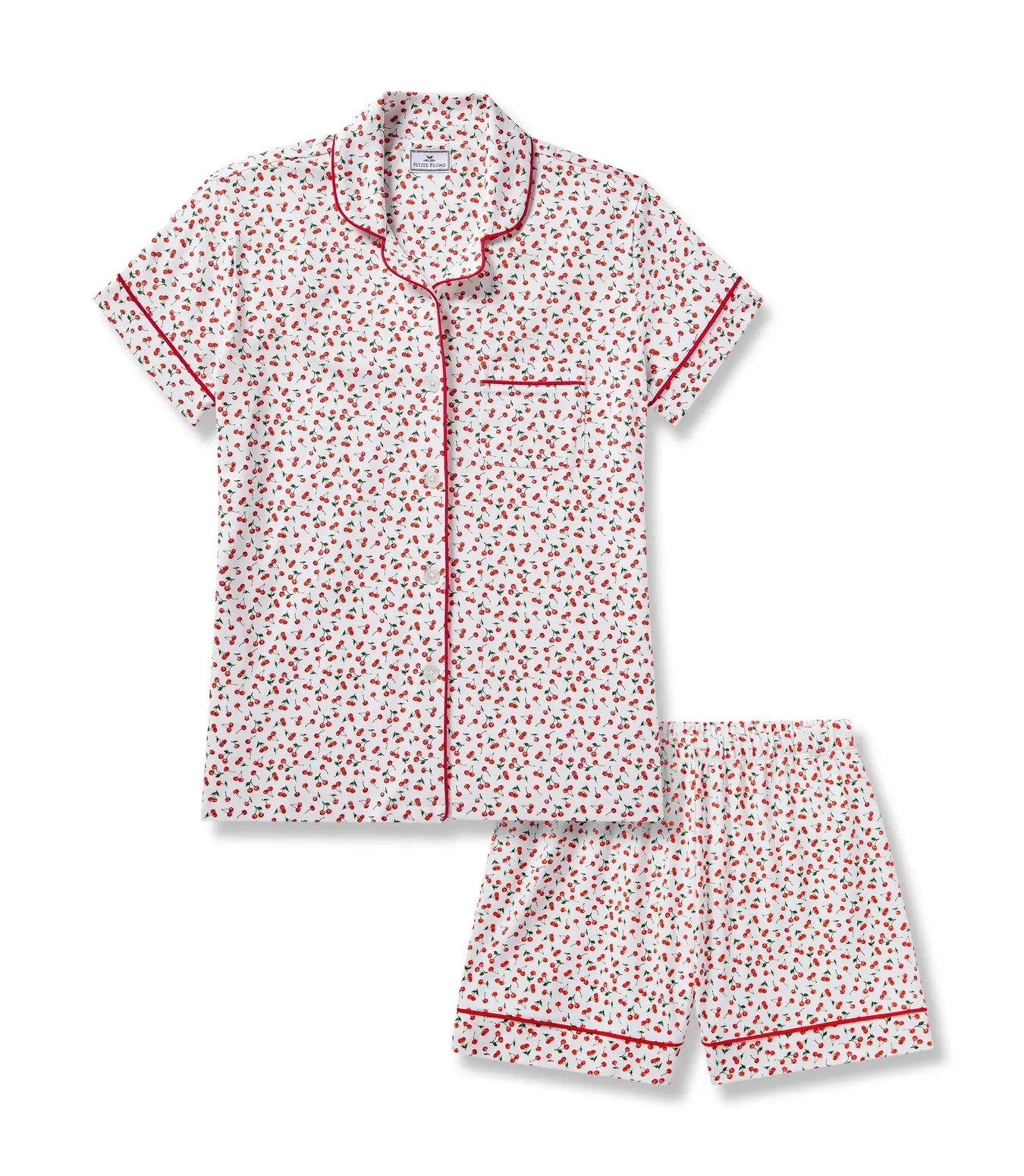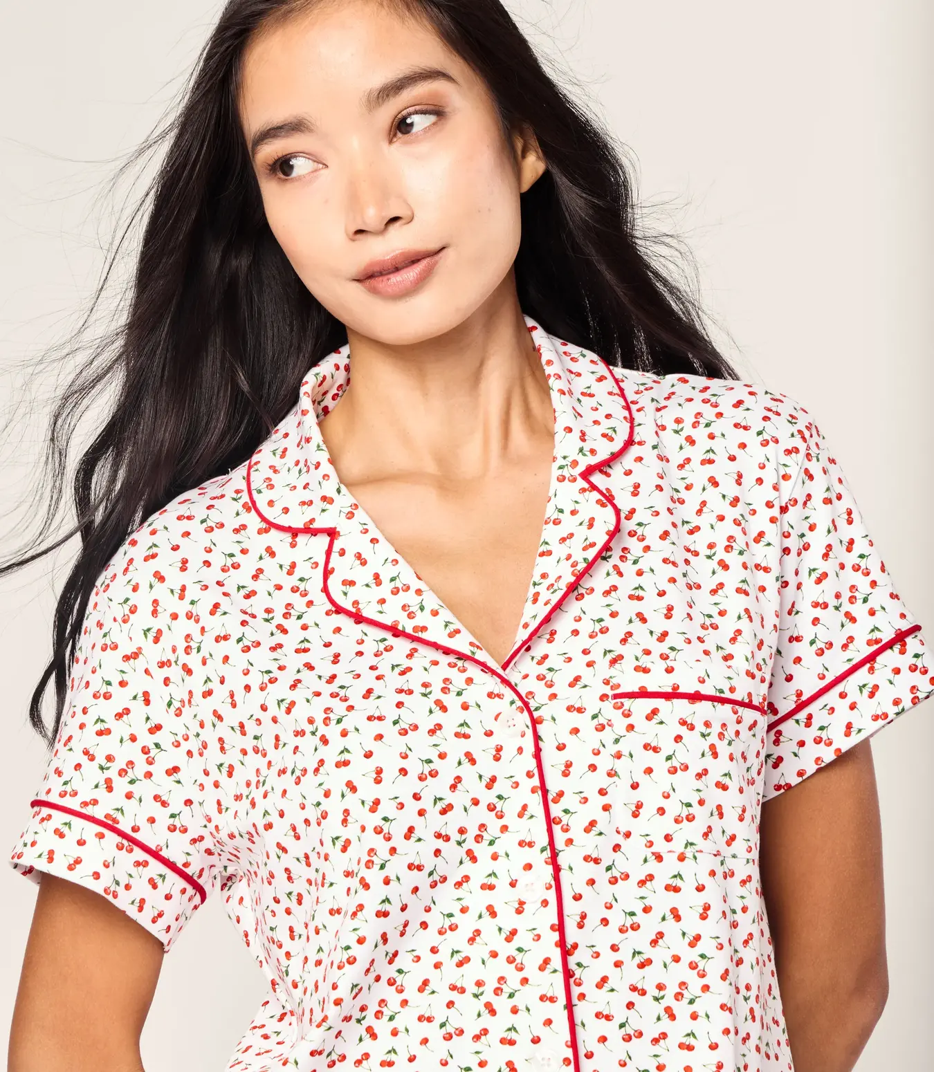 What's sweeter than this? The new Cherry Orchard print is perfect for summer escapes. This is an abbreviated version of our Classic PJs with all the same refinement (lovely tailored piping details, deep pockets) but in a flirty.