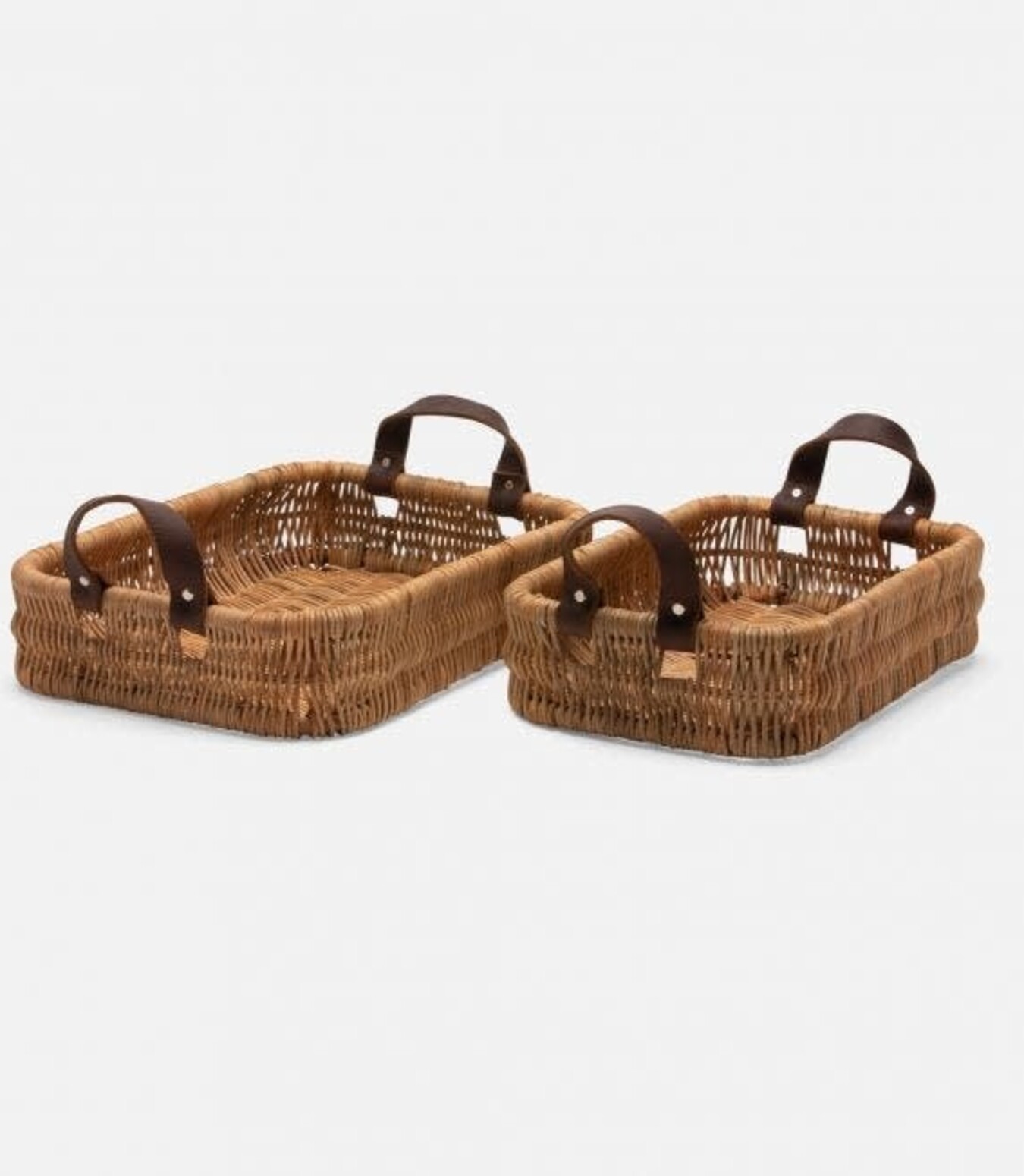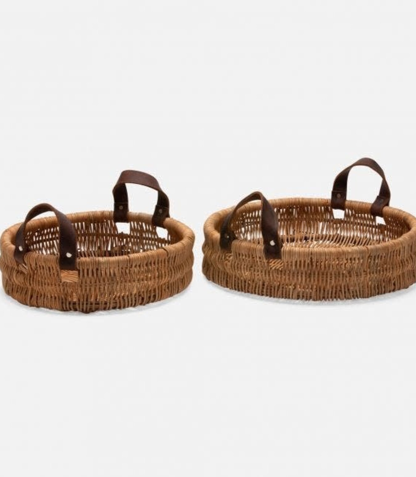 Round or rectangular, these handcrafted peeled wicker baskets are elevated simplicity. Wrapped edges and durable leather handles in a rich, distressed brown. Set of two.