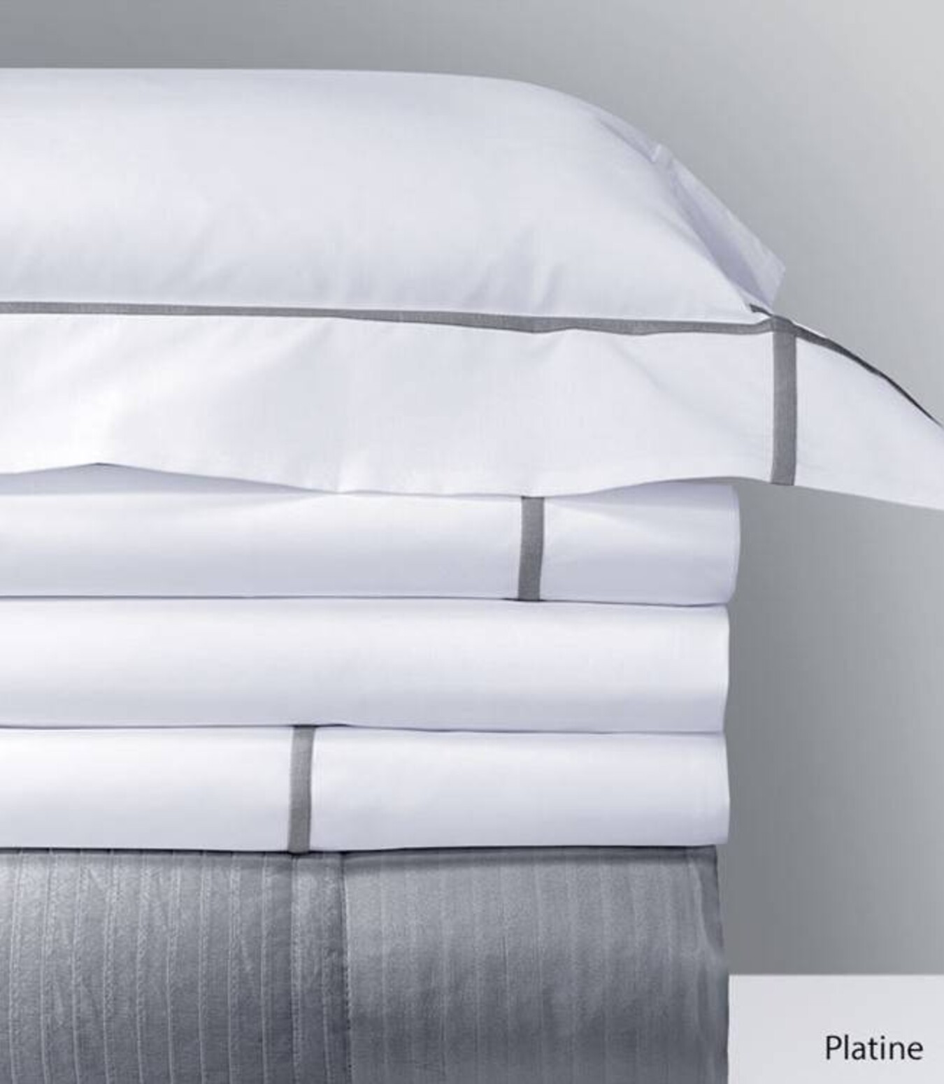 Egyptian Combed Cotton, Solid Percale, 500 TC. Available in 10 colors: Blanc, Caramel, Glace, Nacre, Opera, Pierre, Blush, Honey, Platine & Silver.Athena is featured with the Athena Coverlet, which is discontinued.